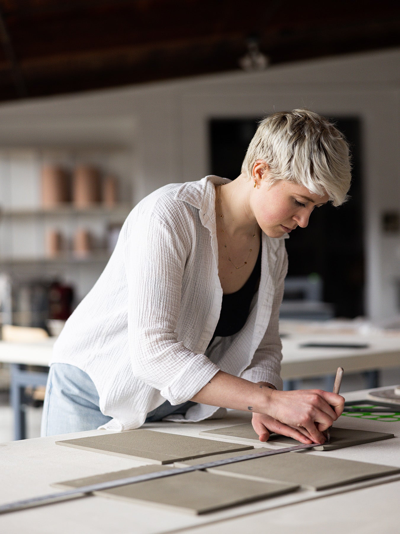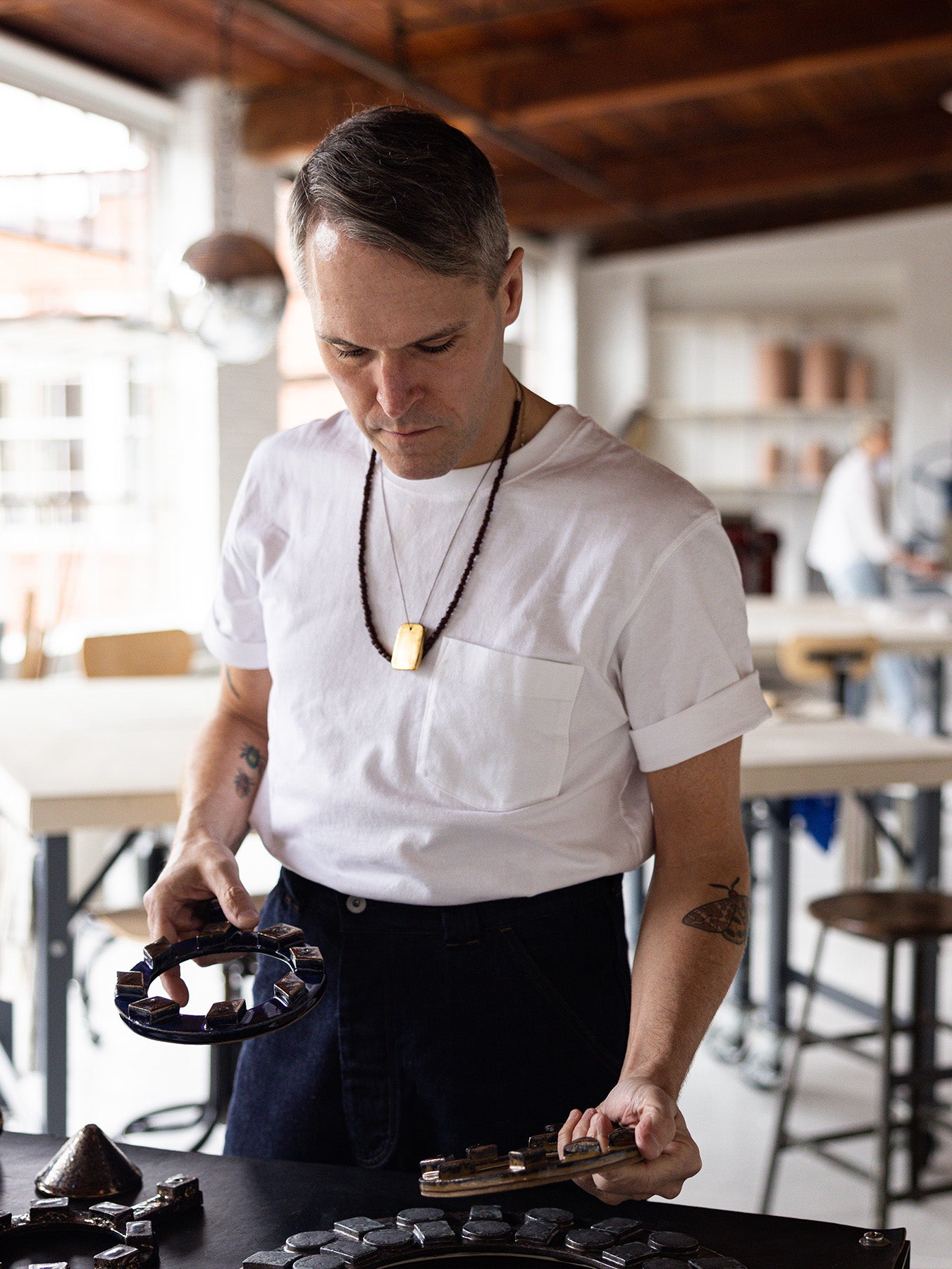 Charlie checking a batch of glazed mirrors. While the studio is a collaborative effort, all pieces are glazed and finished by Charlie.