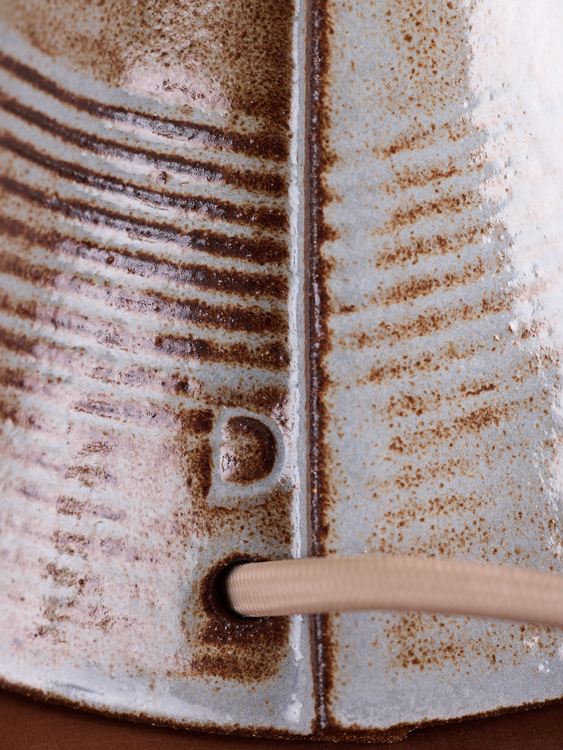 Our stoneware Cono Table Lamp #4 is handcrafted using slab-construction techniques. The lamp’s pattern is created by rolling the surface with textured rolling pins and rods. The lamp’s sgraffiato pattern is created by scoring the surface with a wire-loop tool.