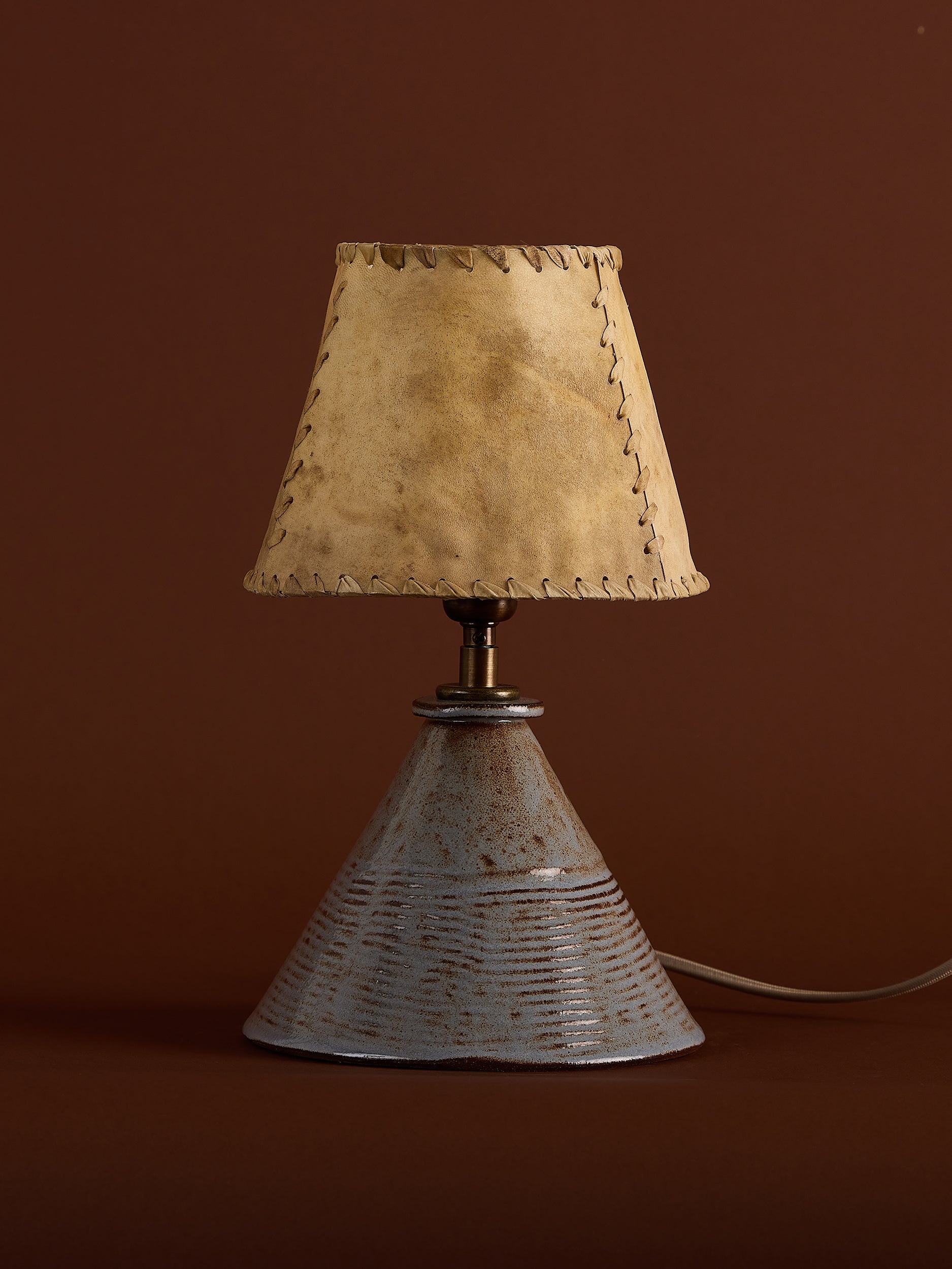 Pictured here in blue shino glaze, antique brass fittings, beige cloth cord, in-line switch and a clip-on a vintage goatskin with rawhide whipstitch. Decades old, each have lived a life, pulling away at the corners of the frame, and gently warped from exposure to moisture.