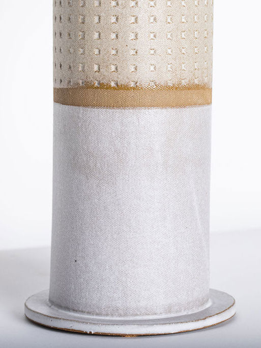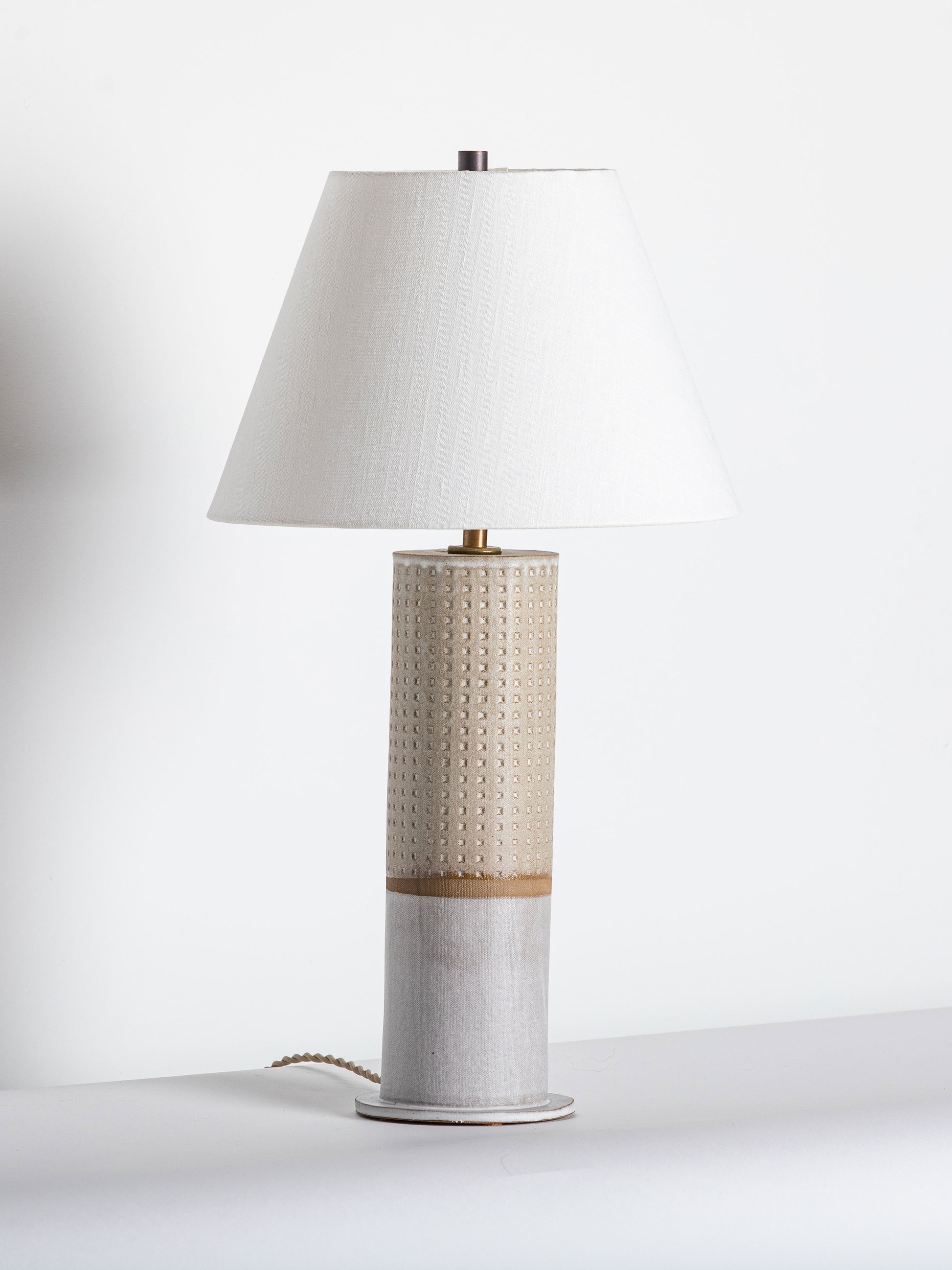 Our stoneware Cusack Lamp is handcrafted using slab-construction techniques. The lamp’s pattern is created by rolling the surface with textured rolling pins and rods.
