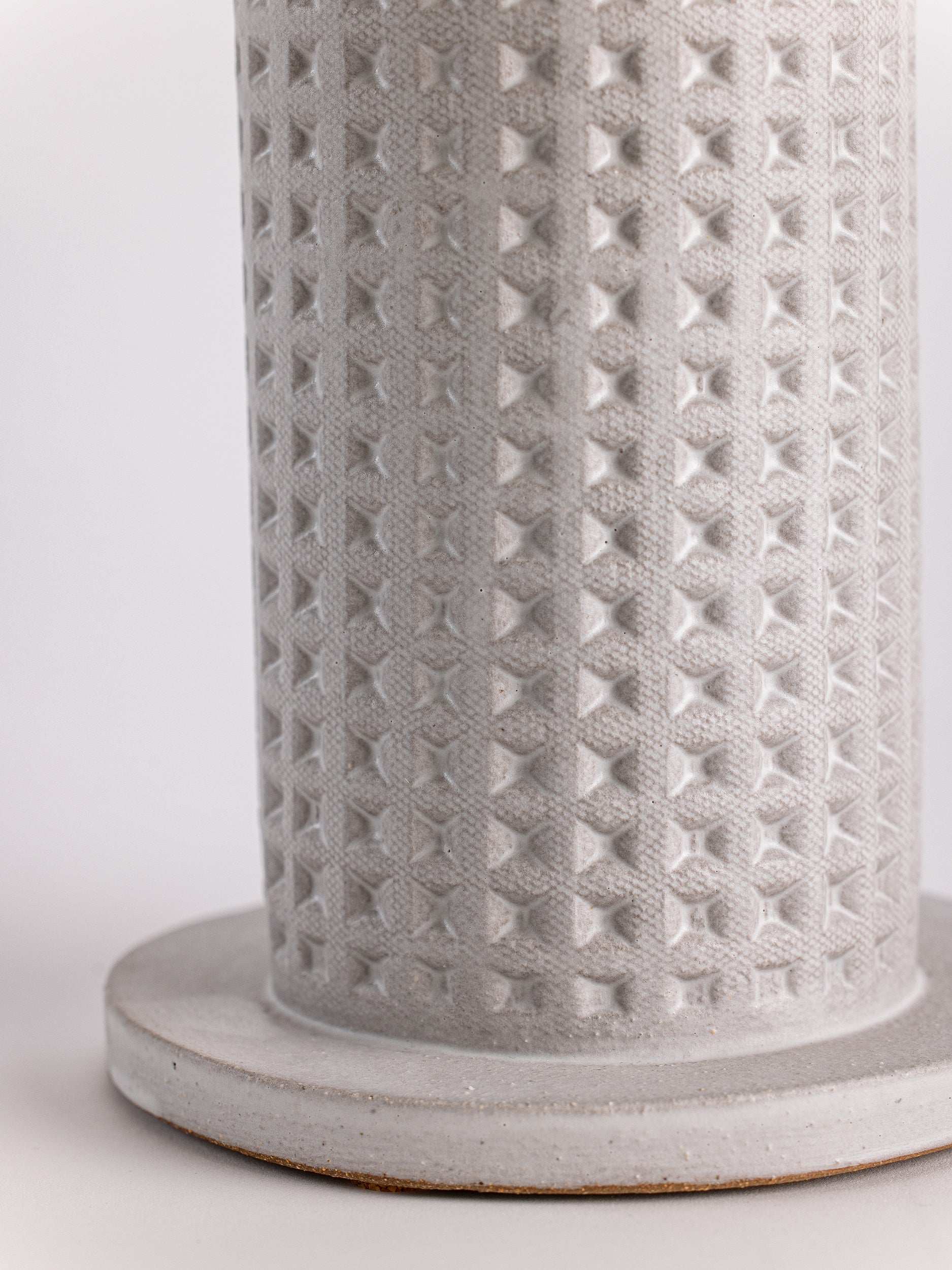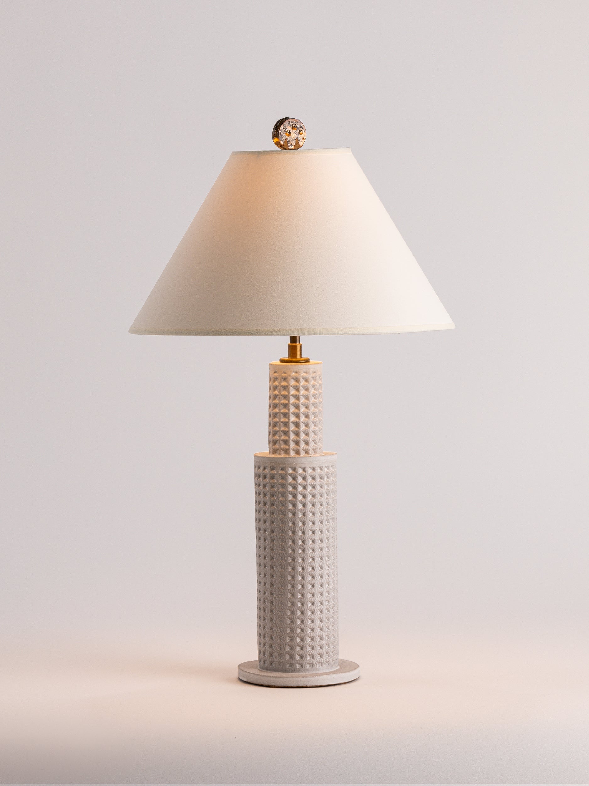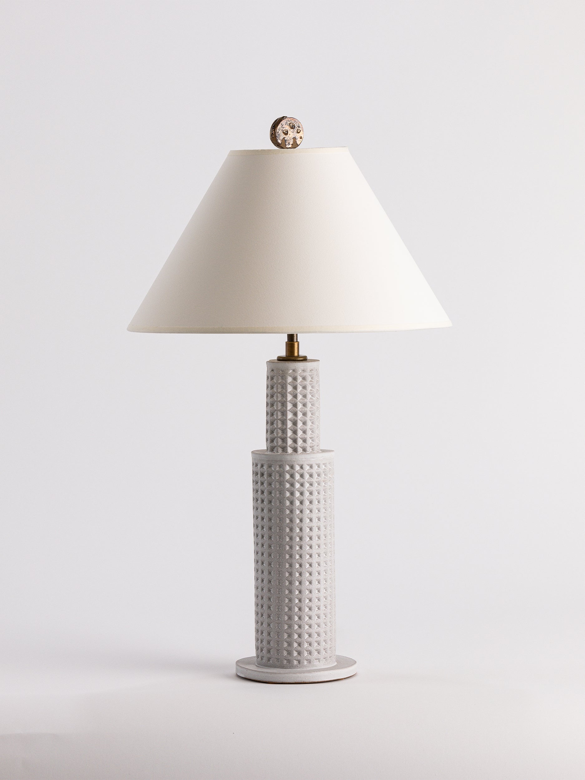 Pictured here in chalk dipped glaze, antique brass fittings, beige cloth cord, full-range dimmer socket, a cracked gold finial, and an archival paper shade.