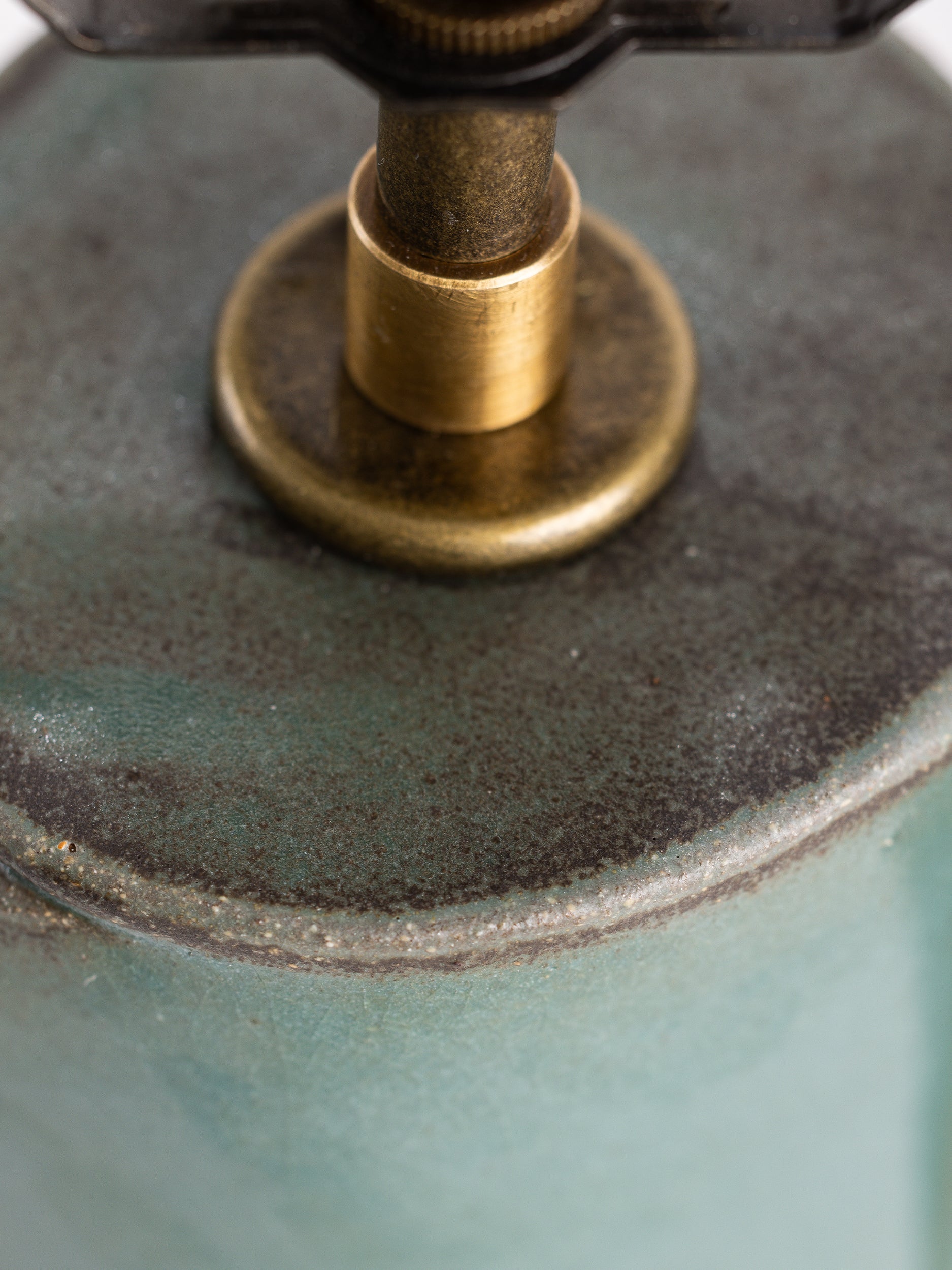 Pictured here in verdigris dipped glaze, antique brass fittings, beige cloth cord, in-line switch, and an archival paper clip-on shade.