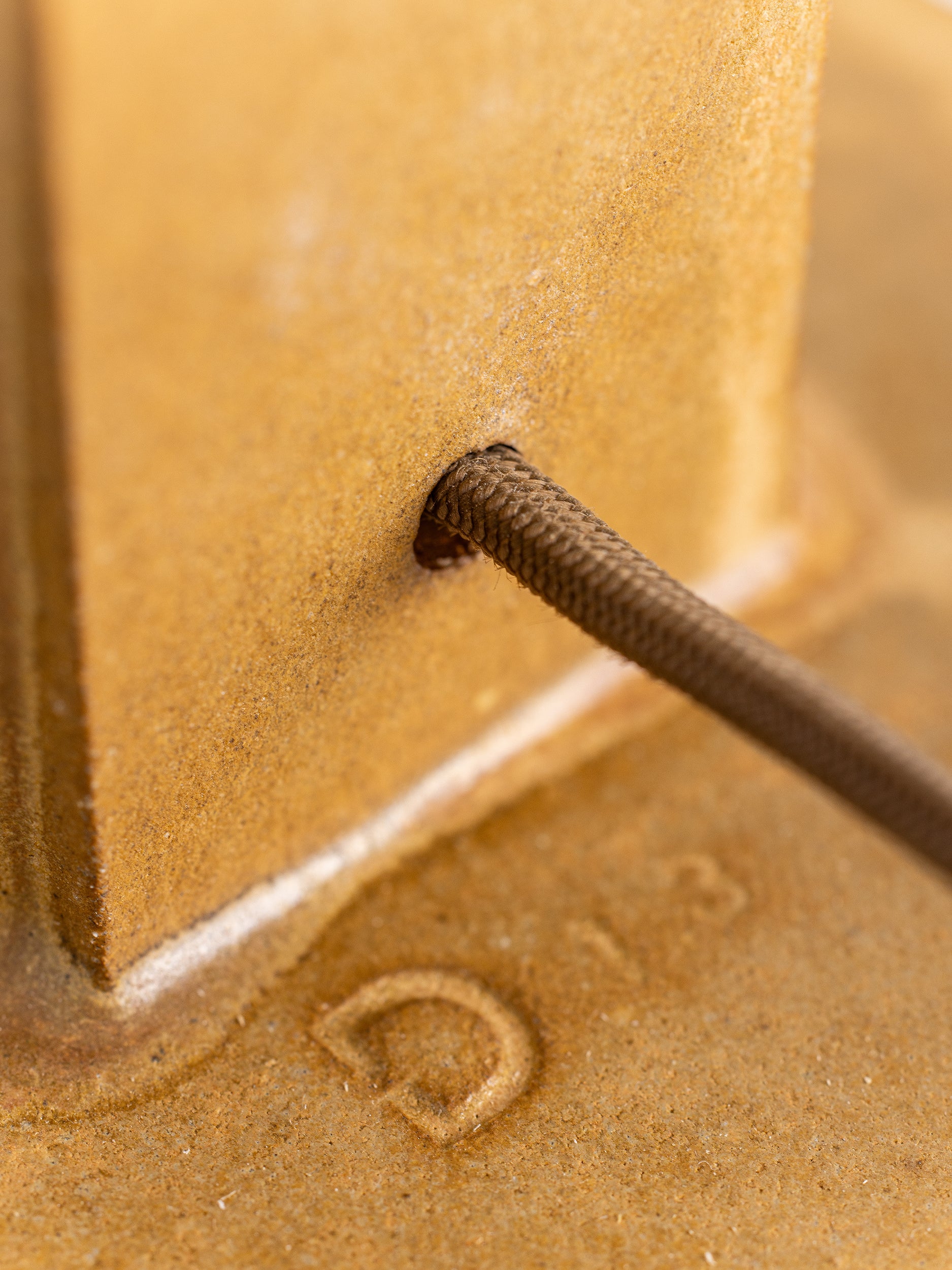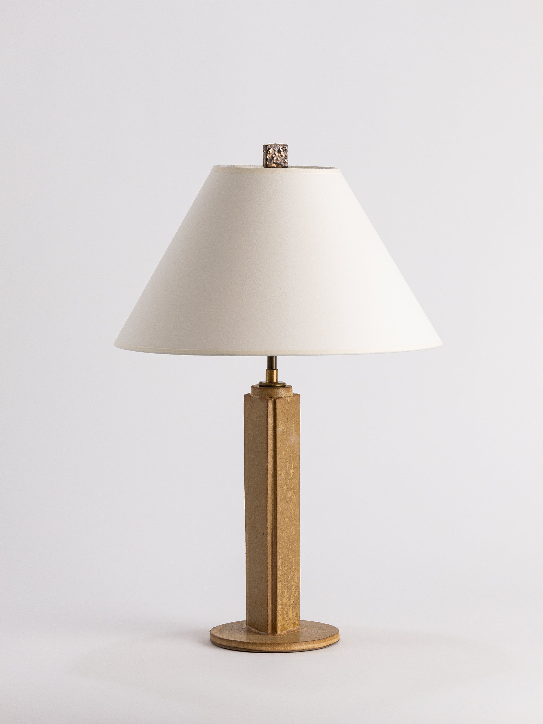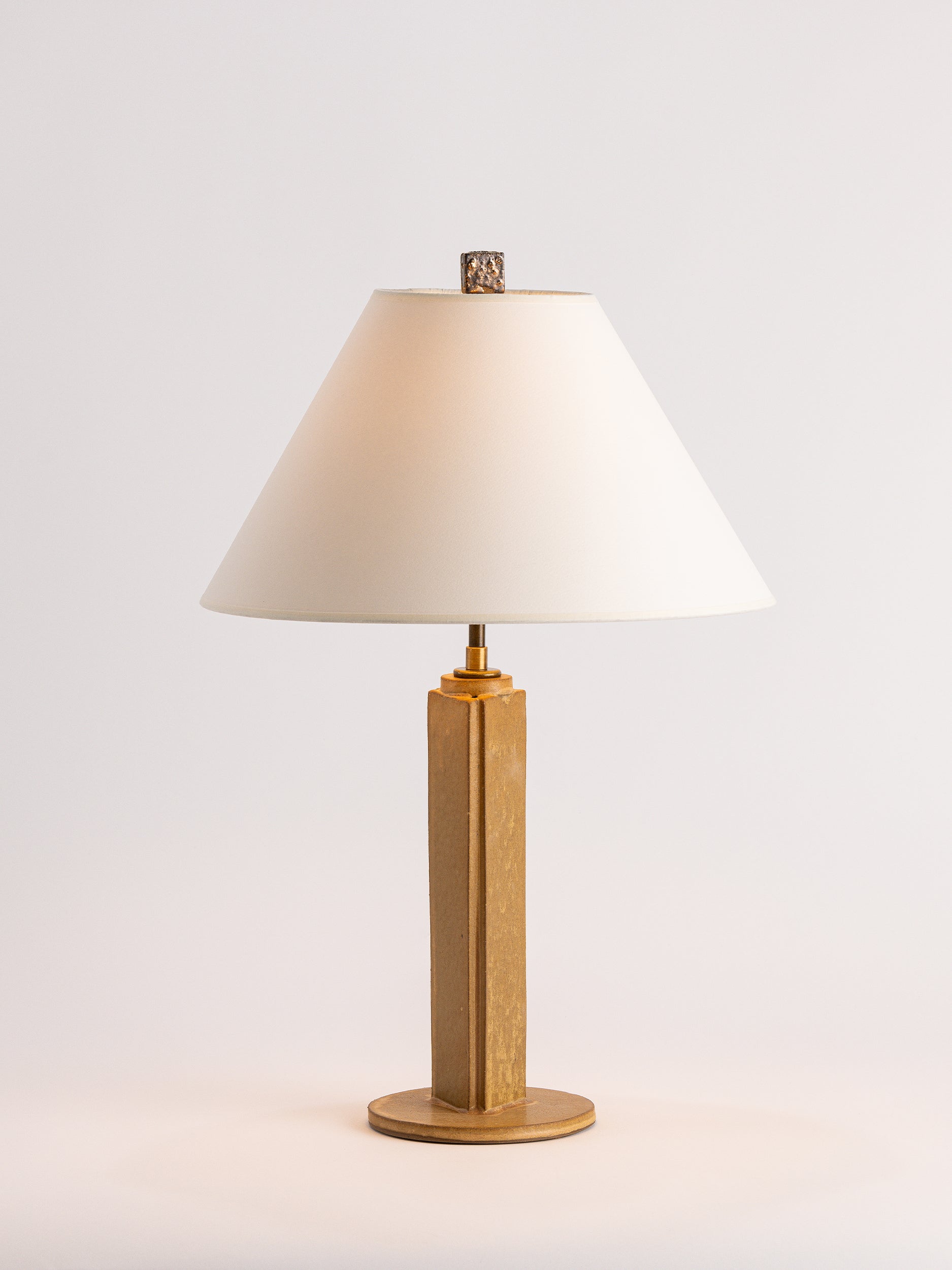 Pictured here in hide dipped glaze, antique brass fittings, beige cloth cord, full-range dimmer socket, a cracked gold finial, and an archival paper shade.