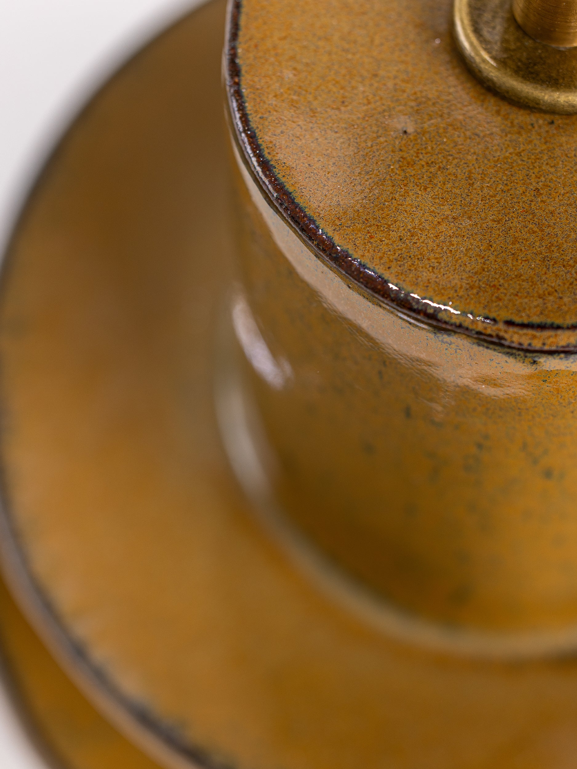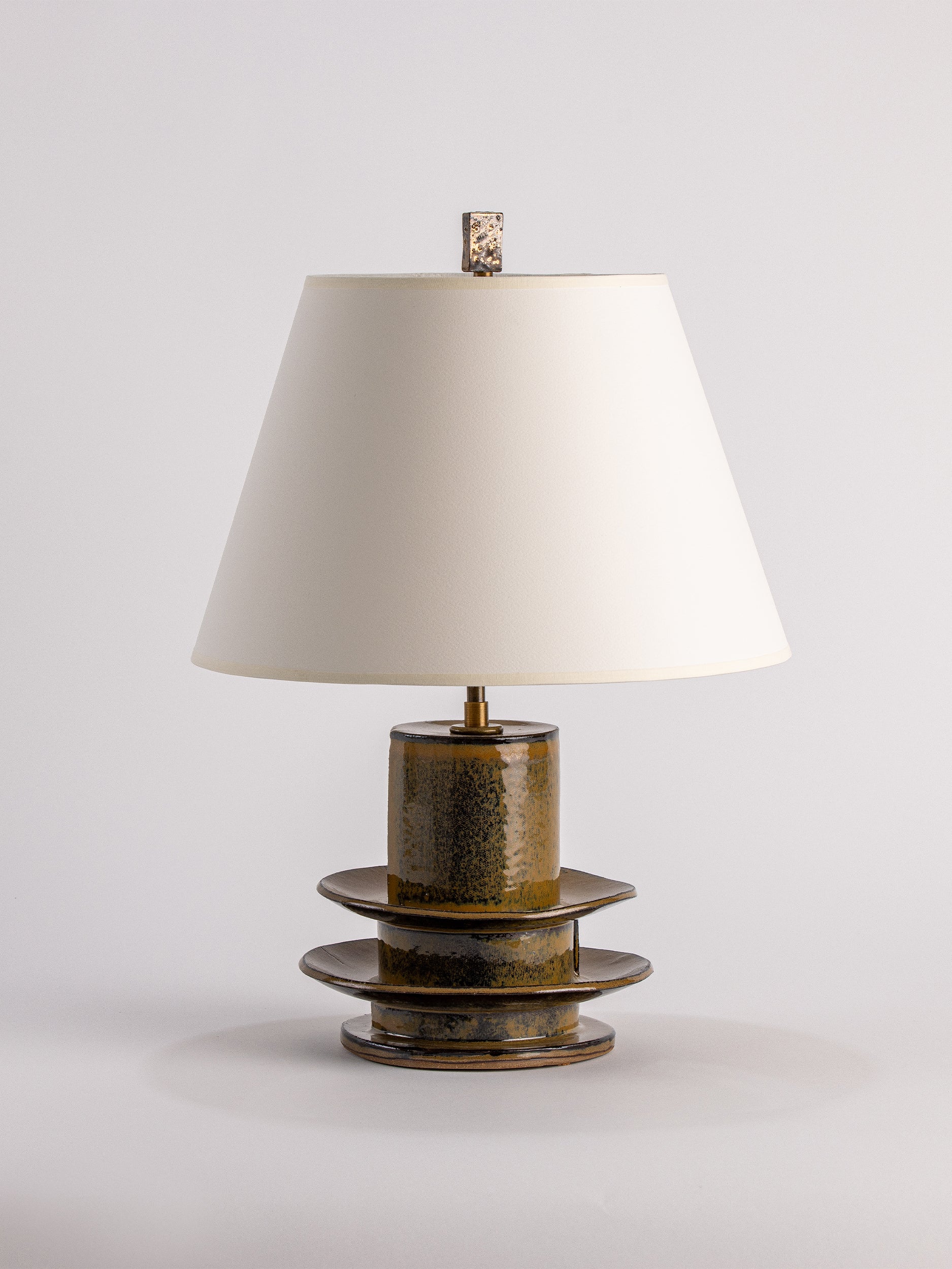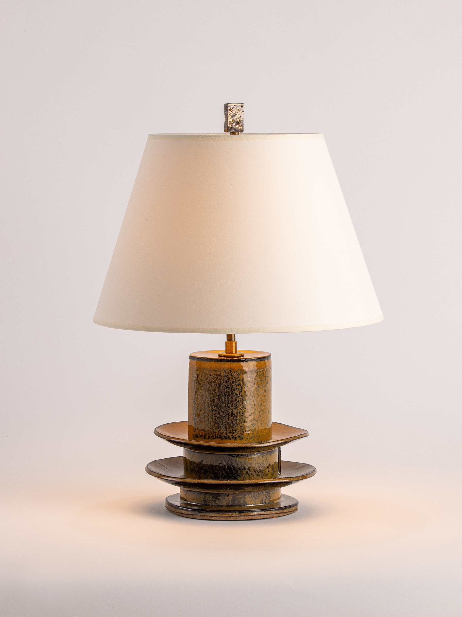 Pictured here in mushroom dipped glaze, antique brass fittings, beige cloth cord, full-range dimmer socket, a cracked gold finial, and an archival paper shade.