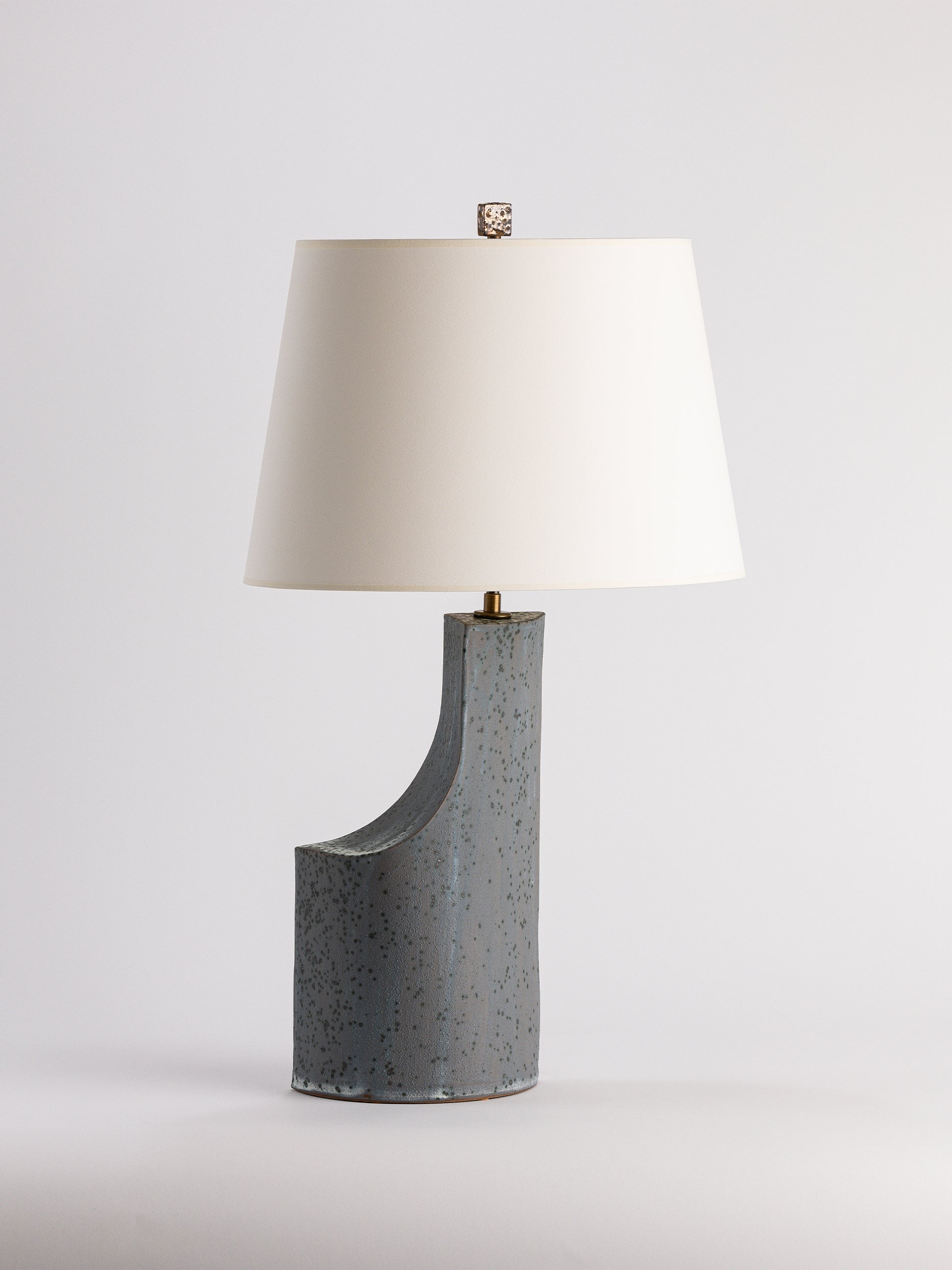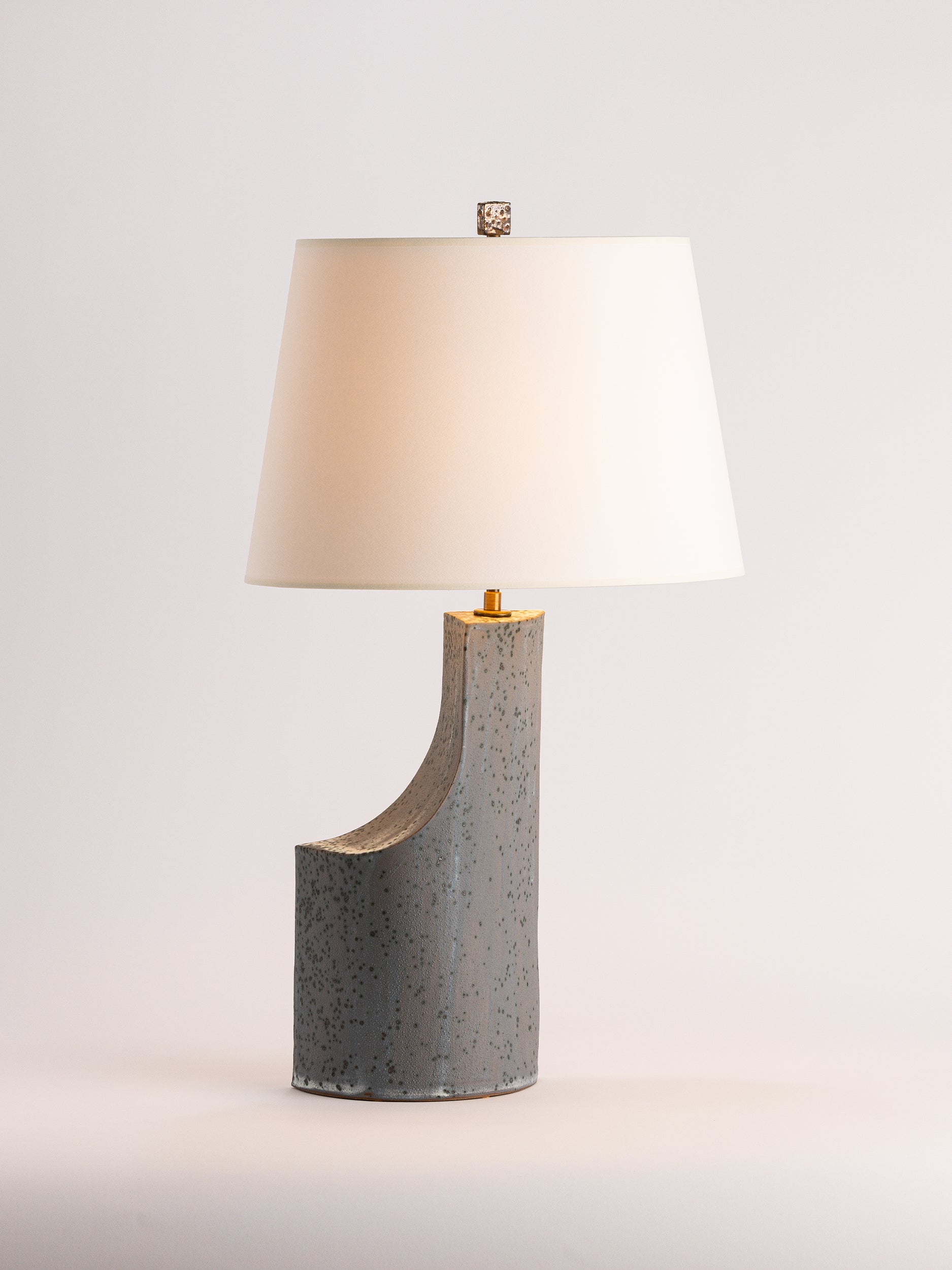 Pictured here in lichen dipped glaze, antique brass fittings, beige cloth cord, full-range dimmer socket, a cracked gold finial, and an archival paper shade.