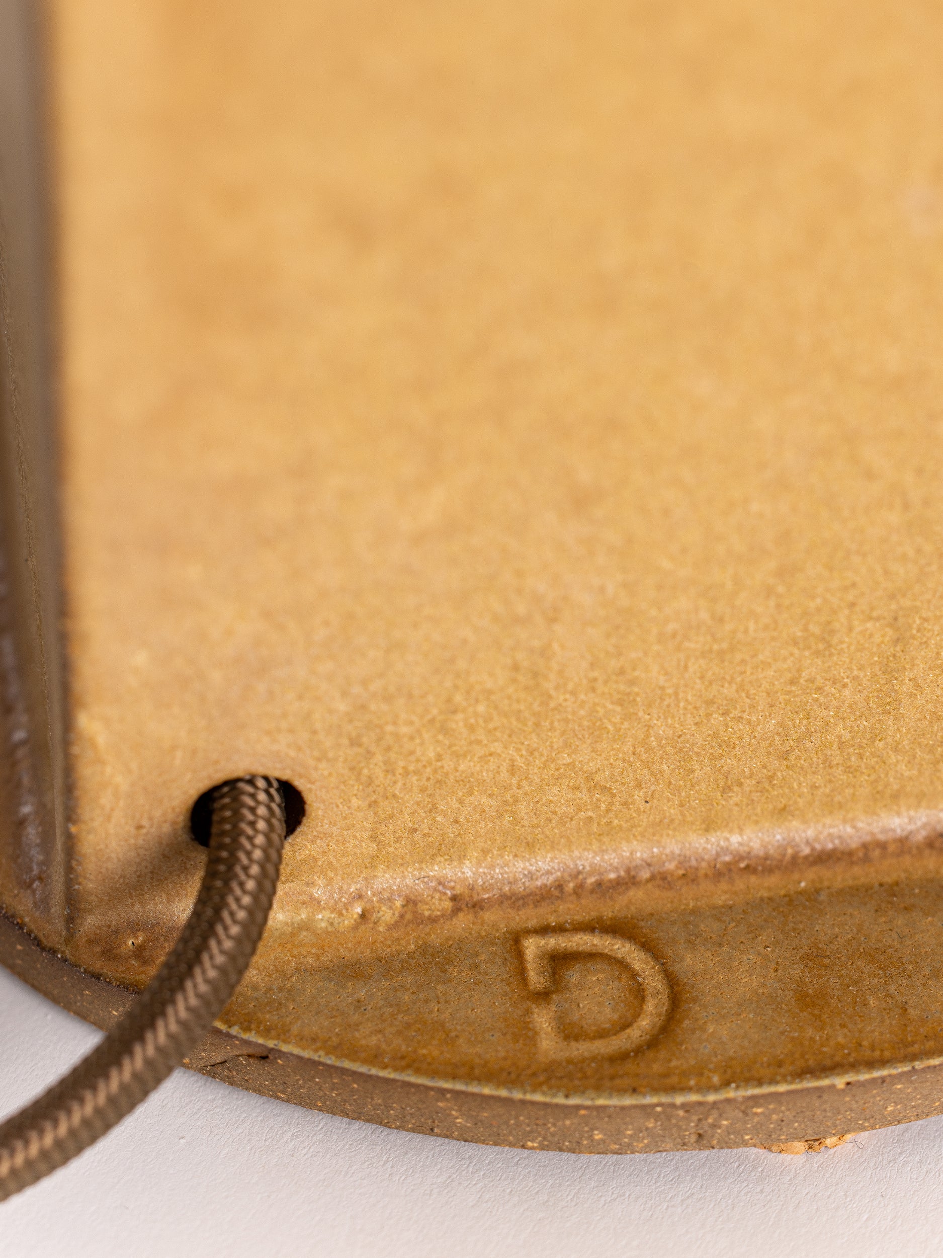 Pictured here in hide dipped glaze, antique brass fittings, beige cloth cord, in-line switch, and an archival paper shade.
