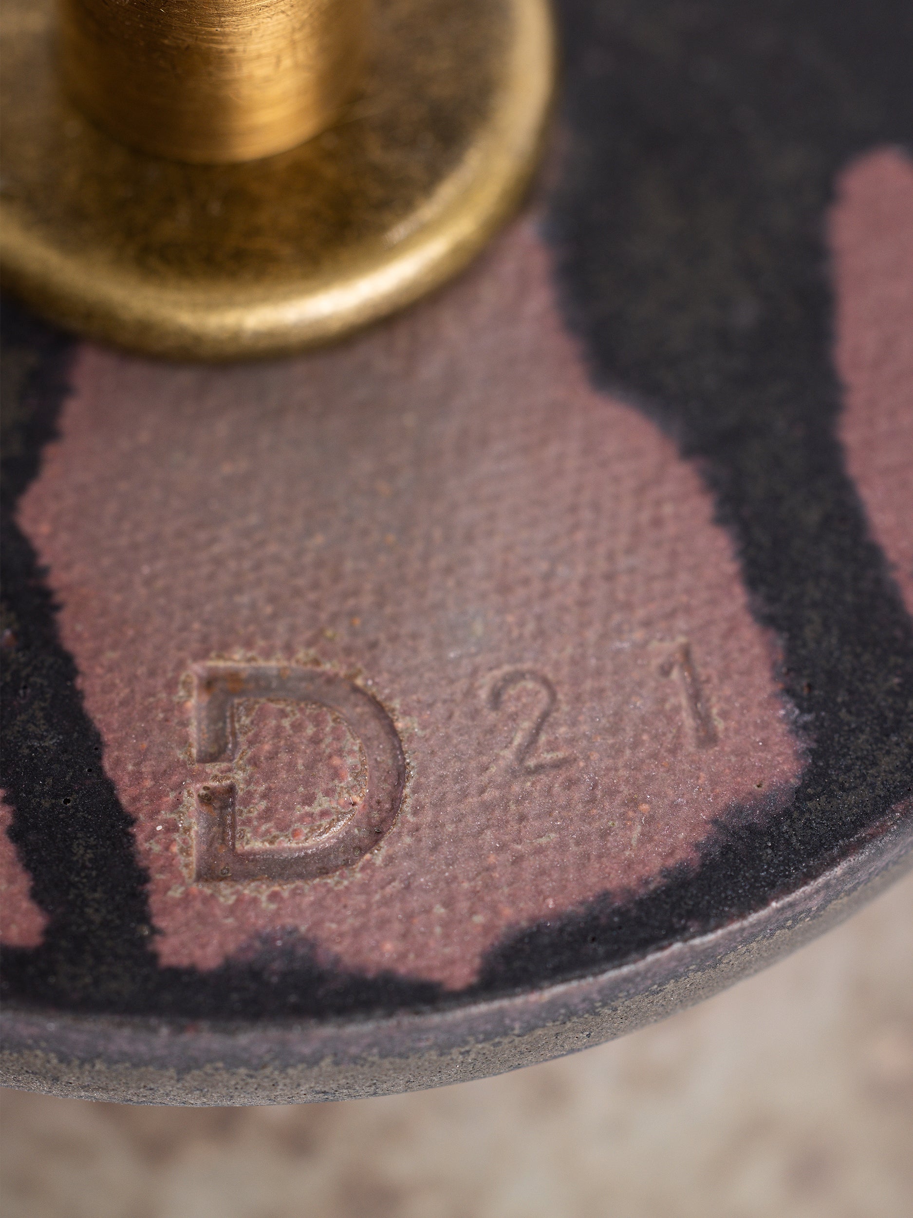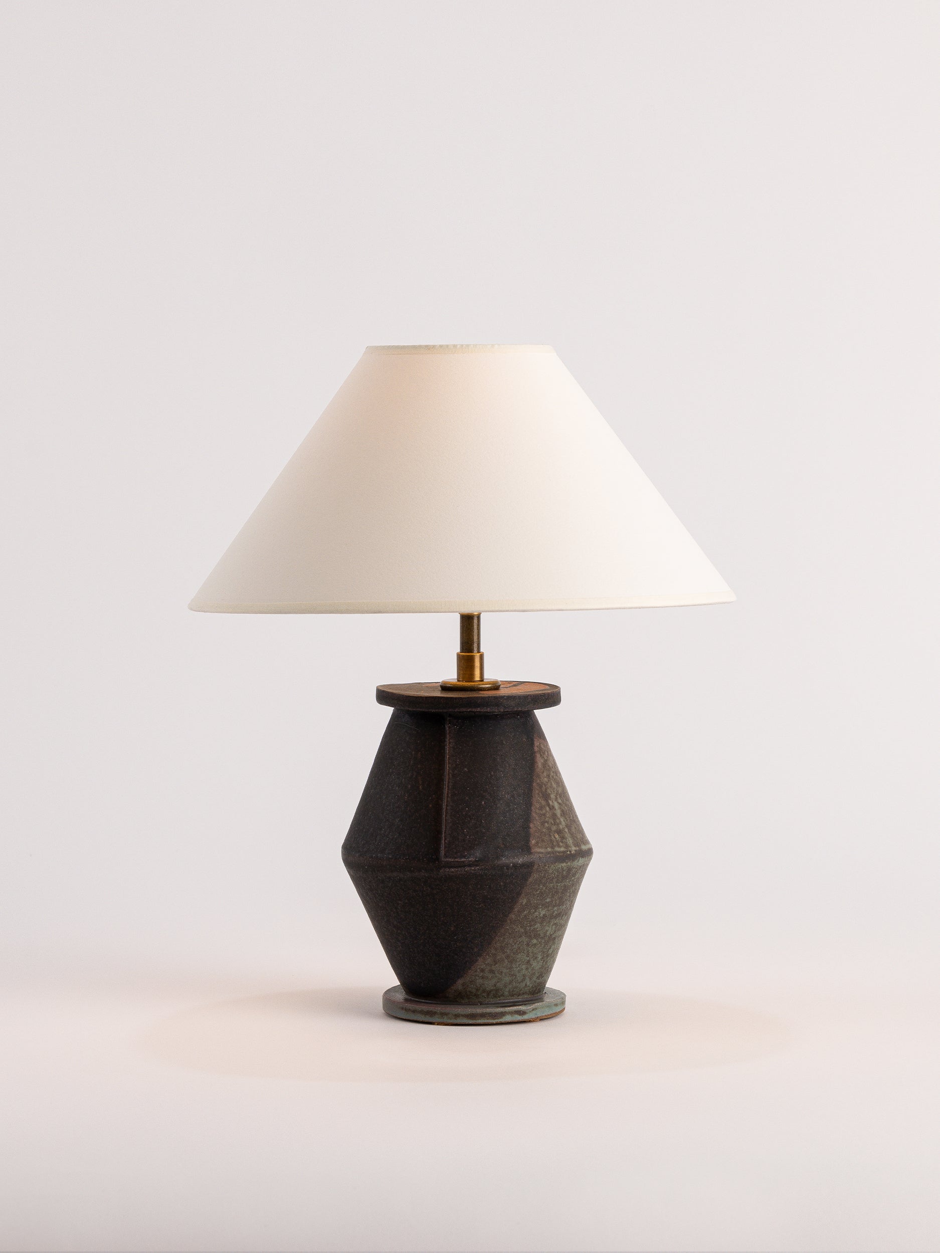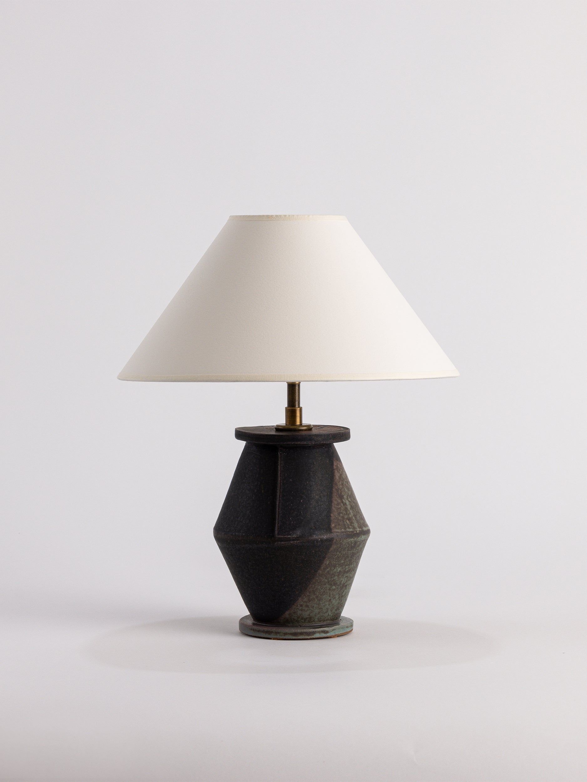 Pictured here in matte-black and verdigris poured glaze, antique brass fittings, black cloth cord, in-line switch, and an archival paper clip-on shade.