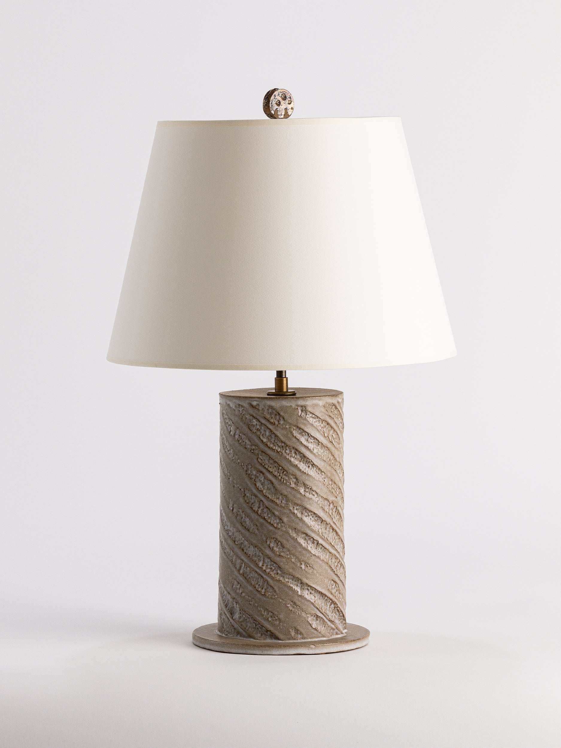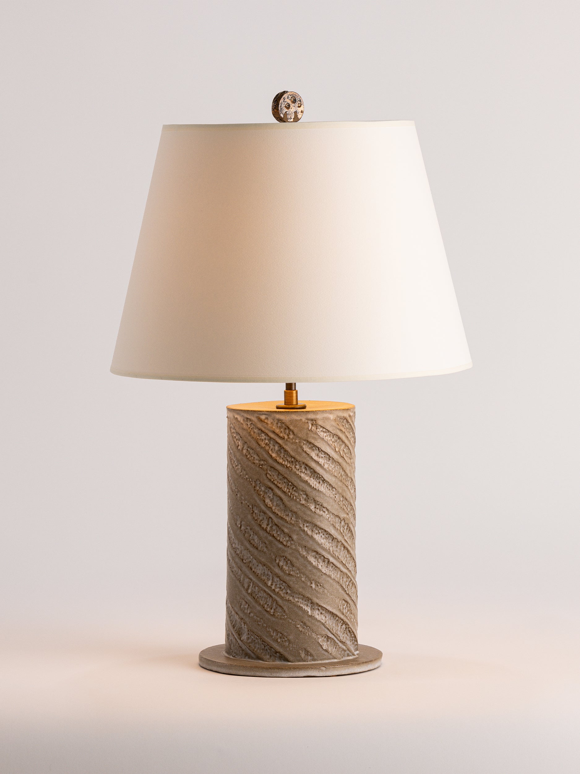 Pictured here in parchment dipped glaze, antique brass fittings, beige cloth cord, full-range dimmer socket, a cracked gold finial, and an archival paper shade.