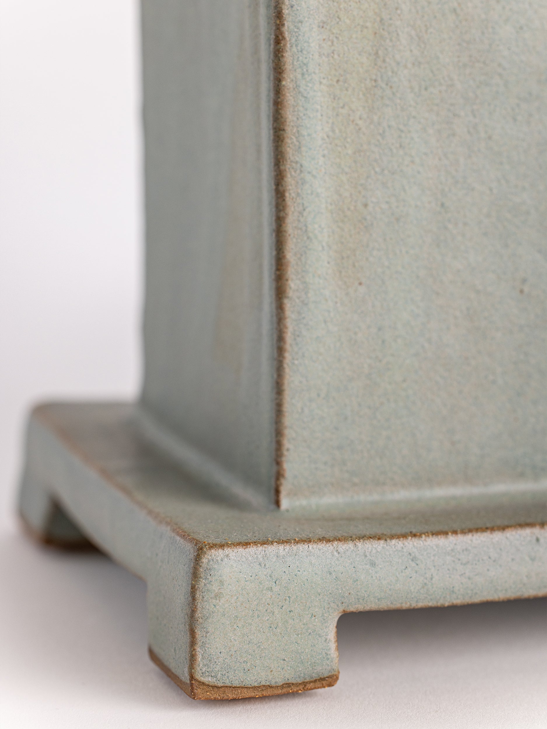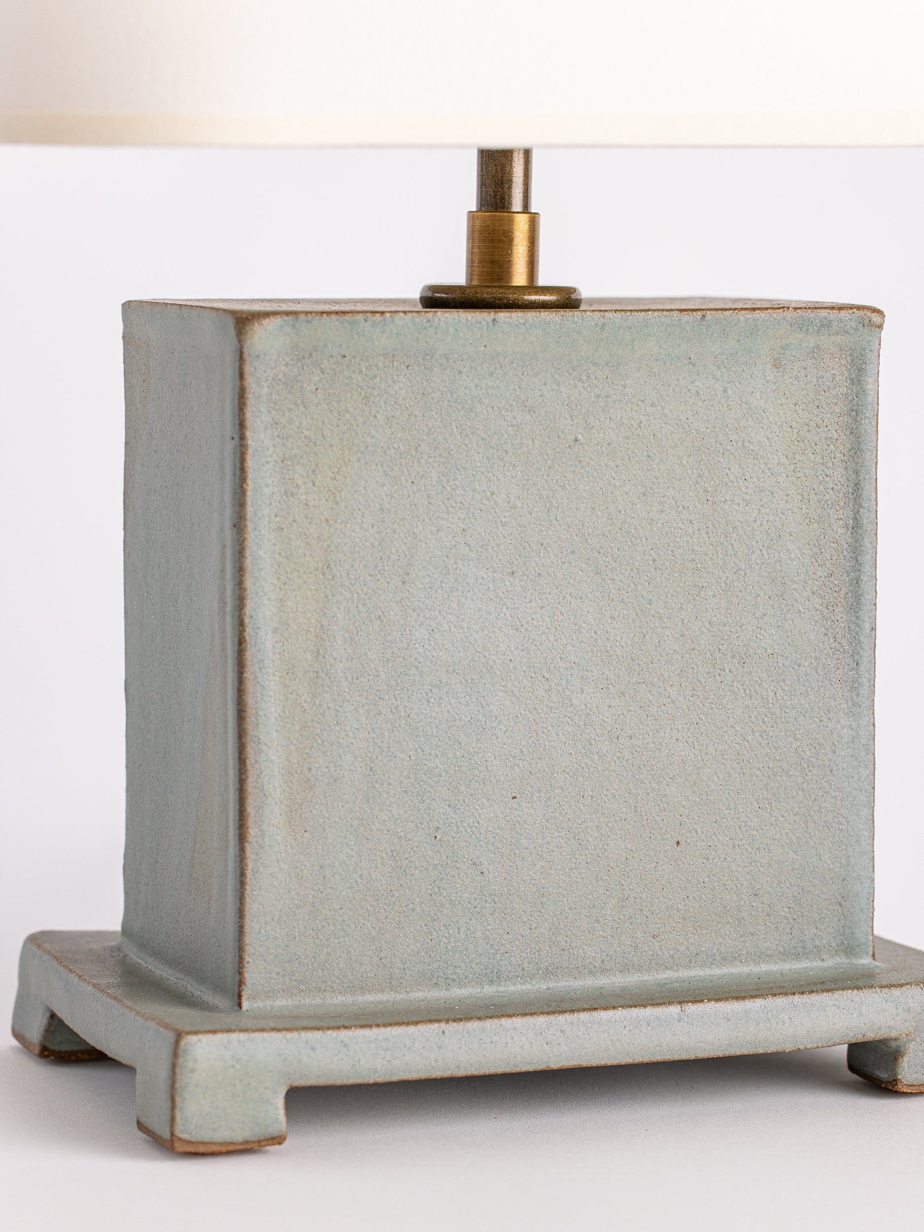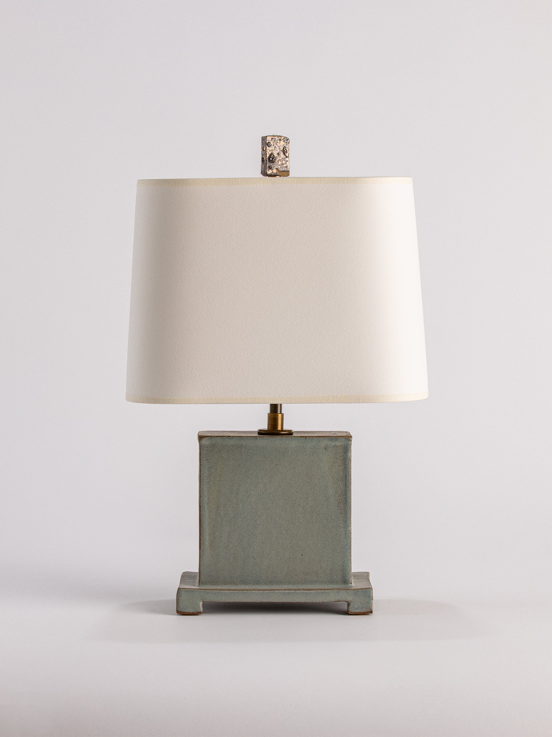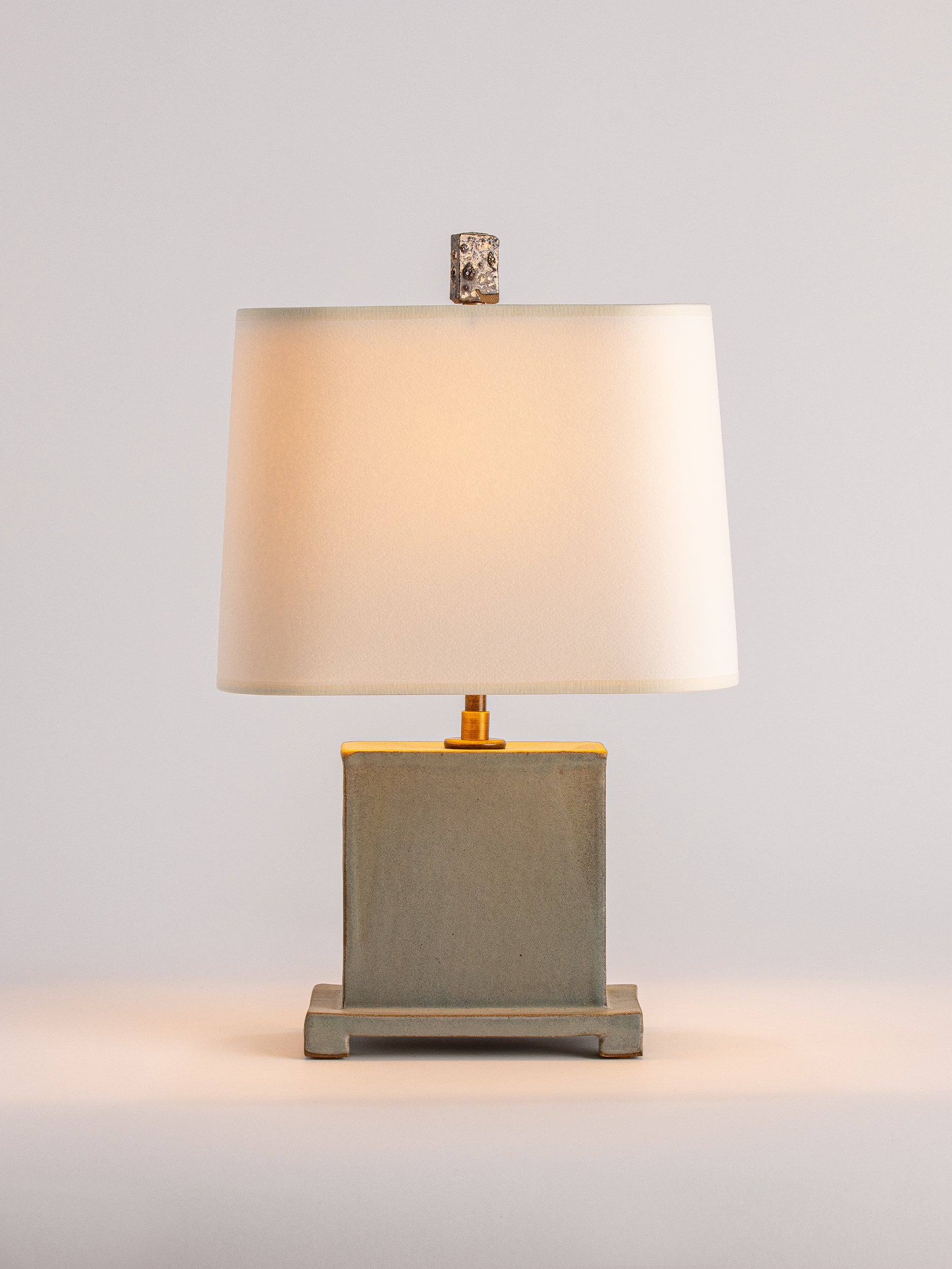 Pictured here in sea dipped glaze, antique brass fittings, beige cloth cord, full-range dimmer socket, a cracked gold finial, and an archival paper shade.
