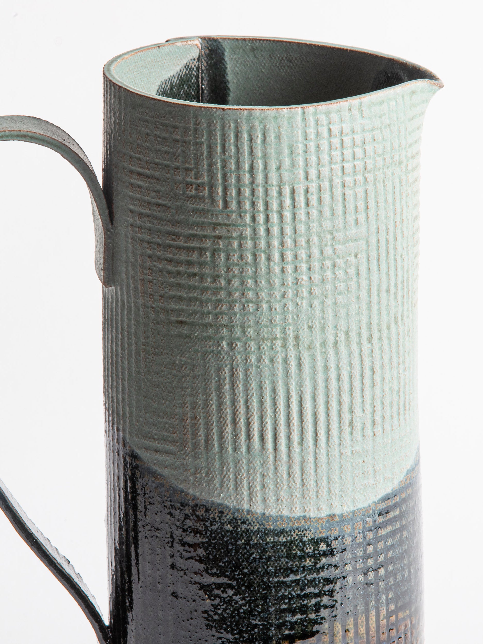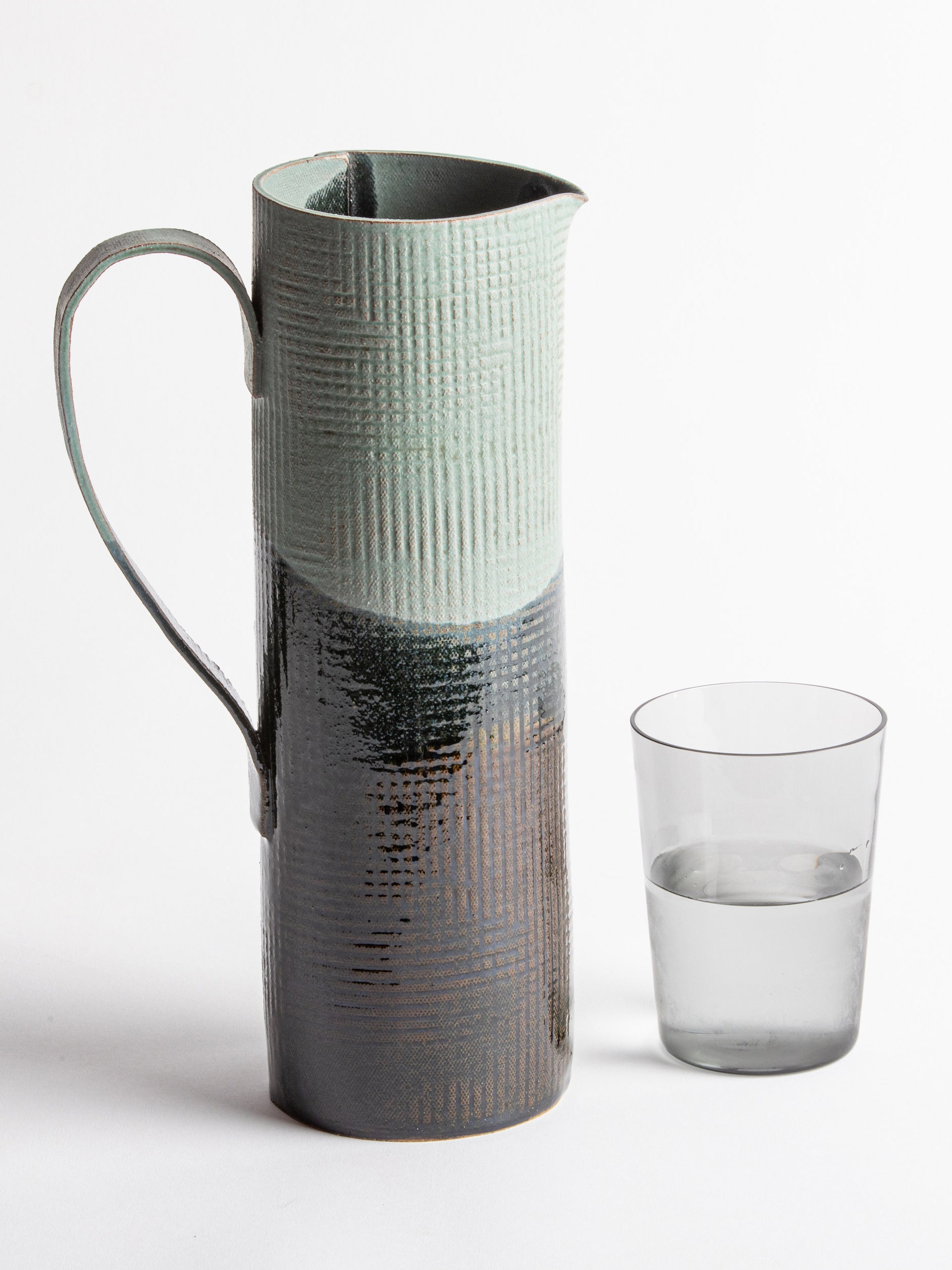 Our stoneware Earthworks Pitcher is handcrafted using slab-construction techniques. The pitcher's pattern is created by rolling the surface with textured rolling pins and rods.
