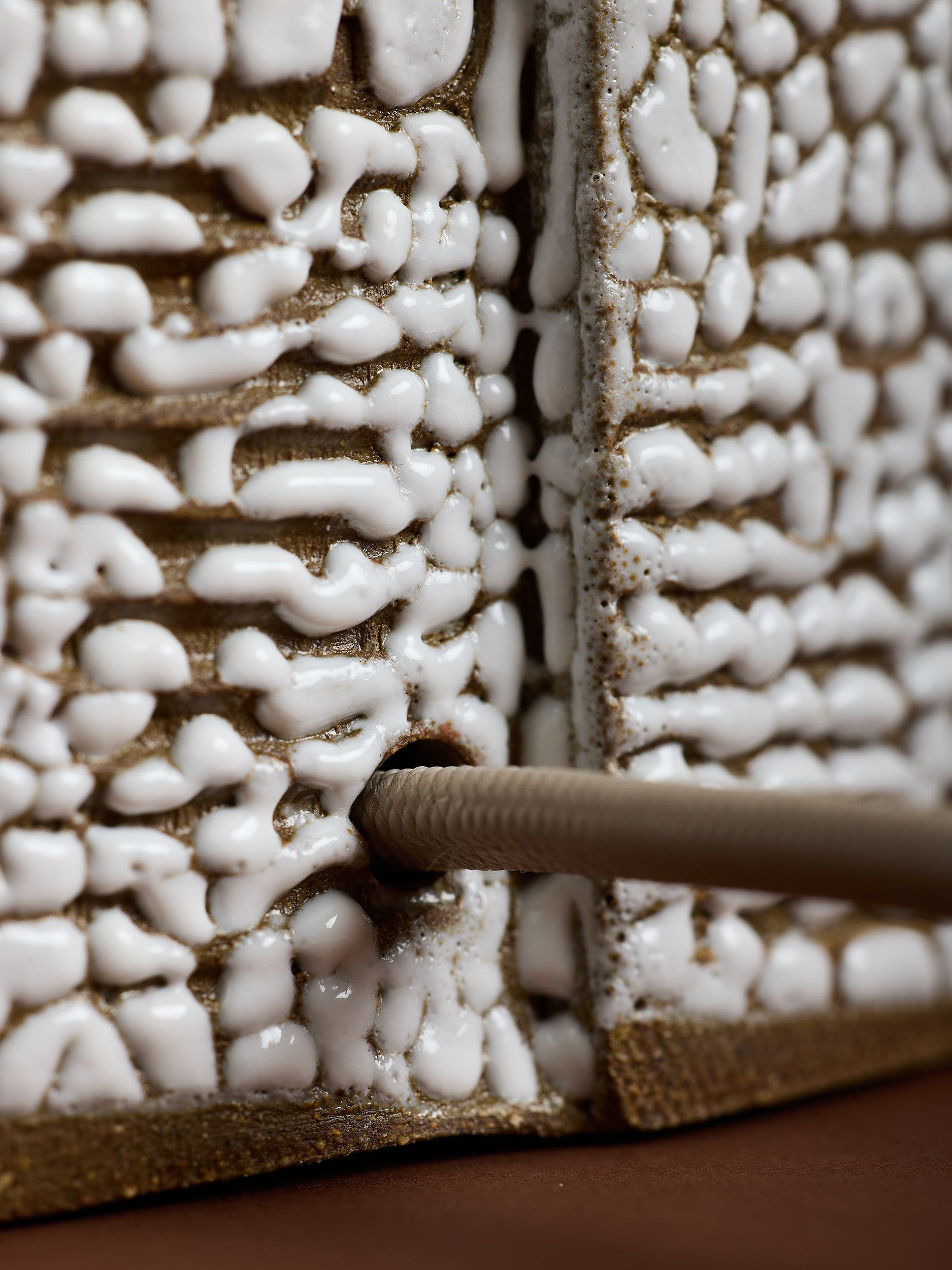Our stoneware Pila Floor Lamp #2 is handcrafted using slab-construction techniques. The lamp’s pattern is created by rolling the surface with textured rolling pins and rods. The lamp’s sgraffiato pattern is created by scoring the surface with a wire-loop tool.