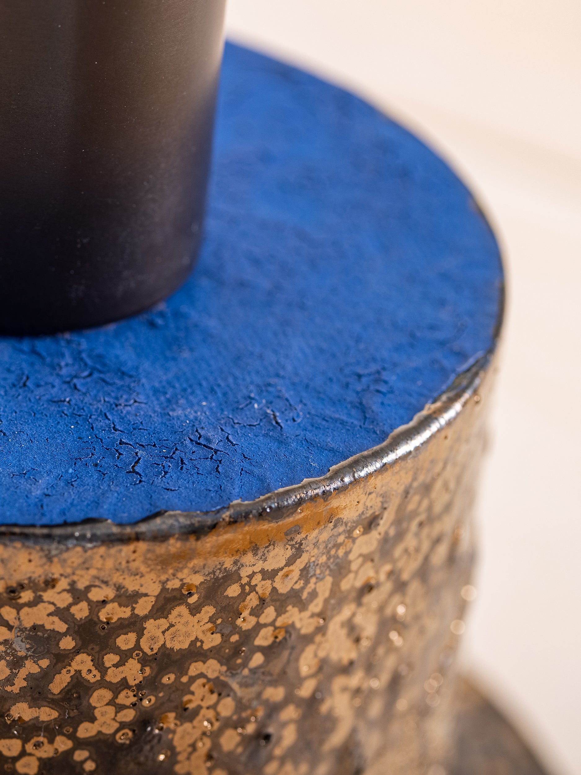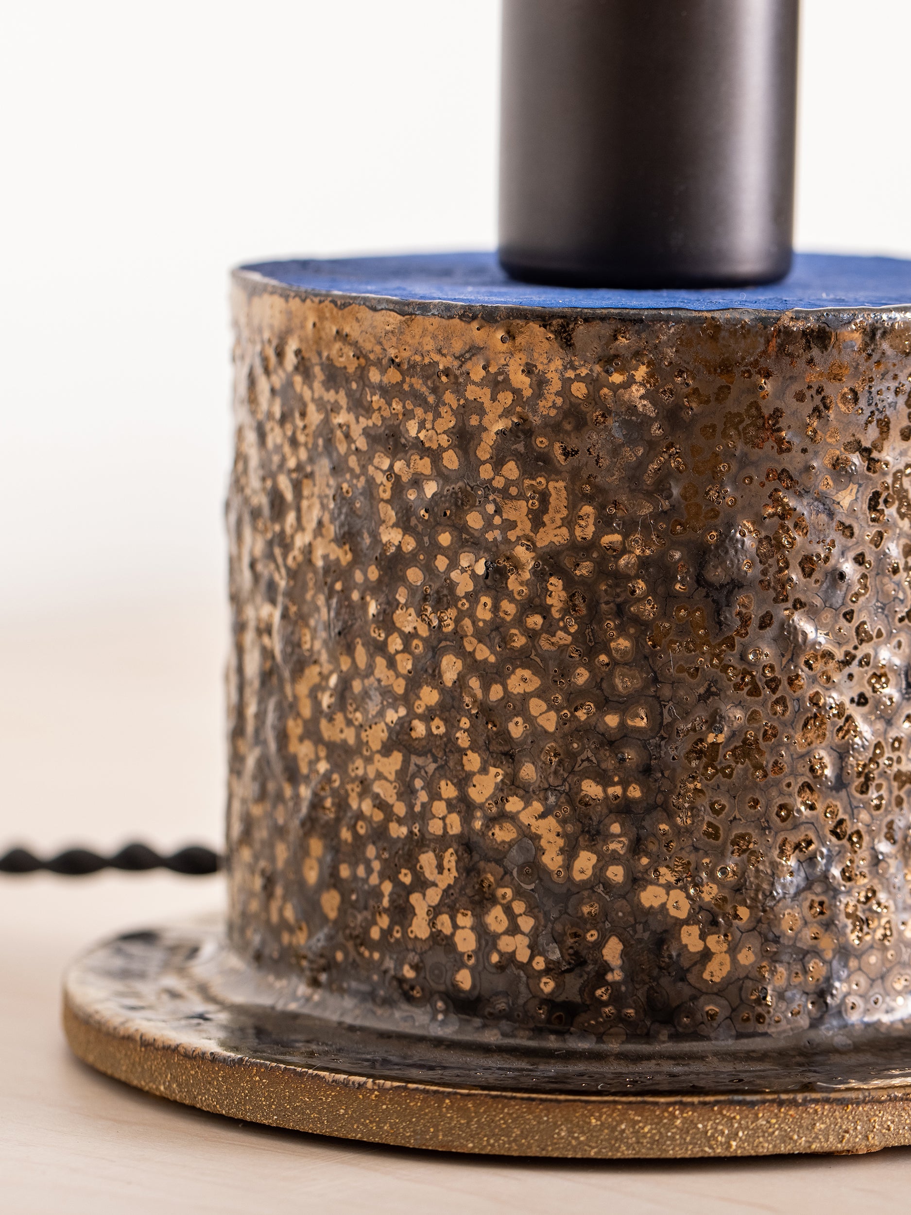 Pictured here in hand-painted cracked gold exterior glaze and ultramarine underglaze, antique brass fittings, black cloth cord, in-line switch, and an ultramarine handkerchief linen shade.