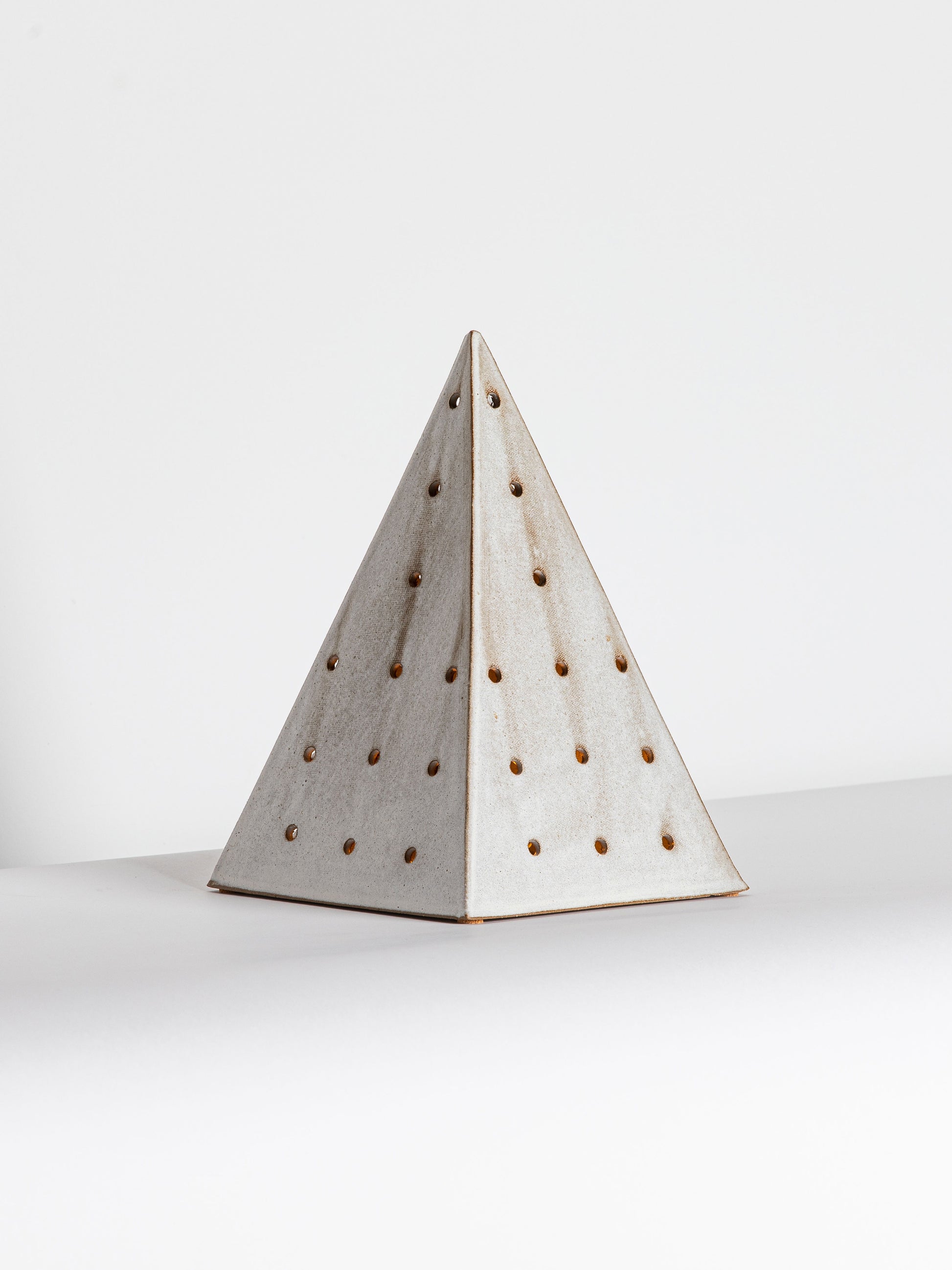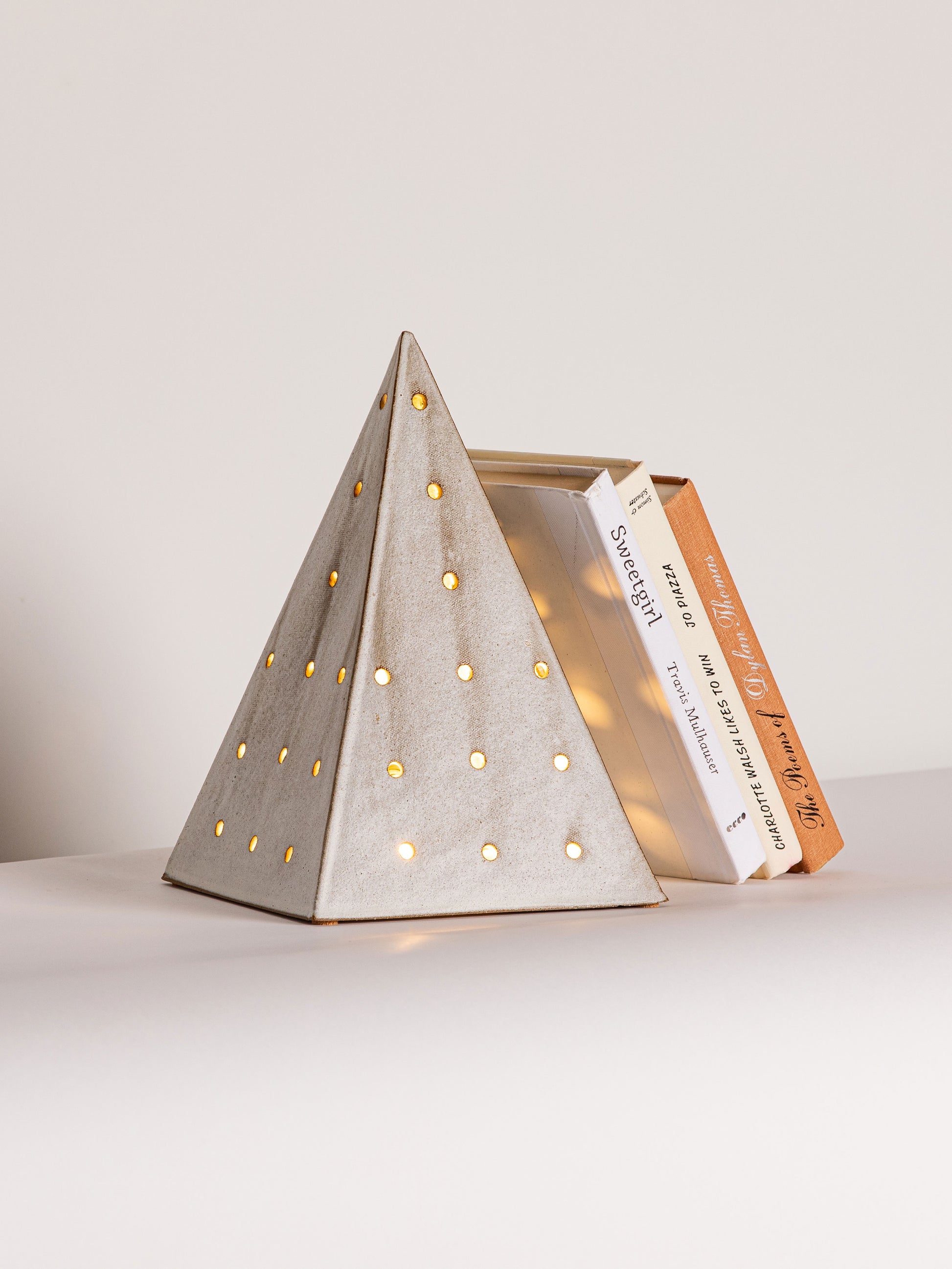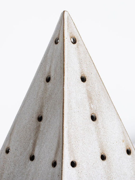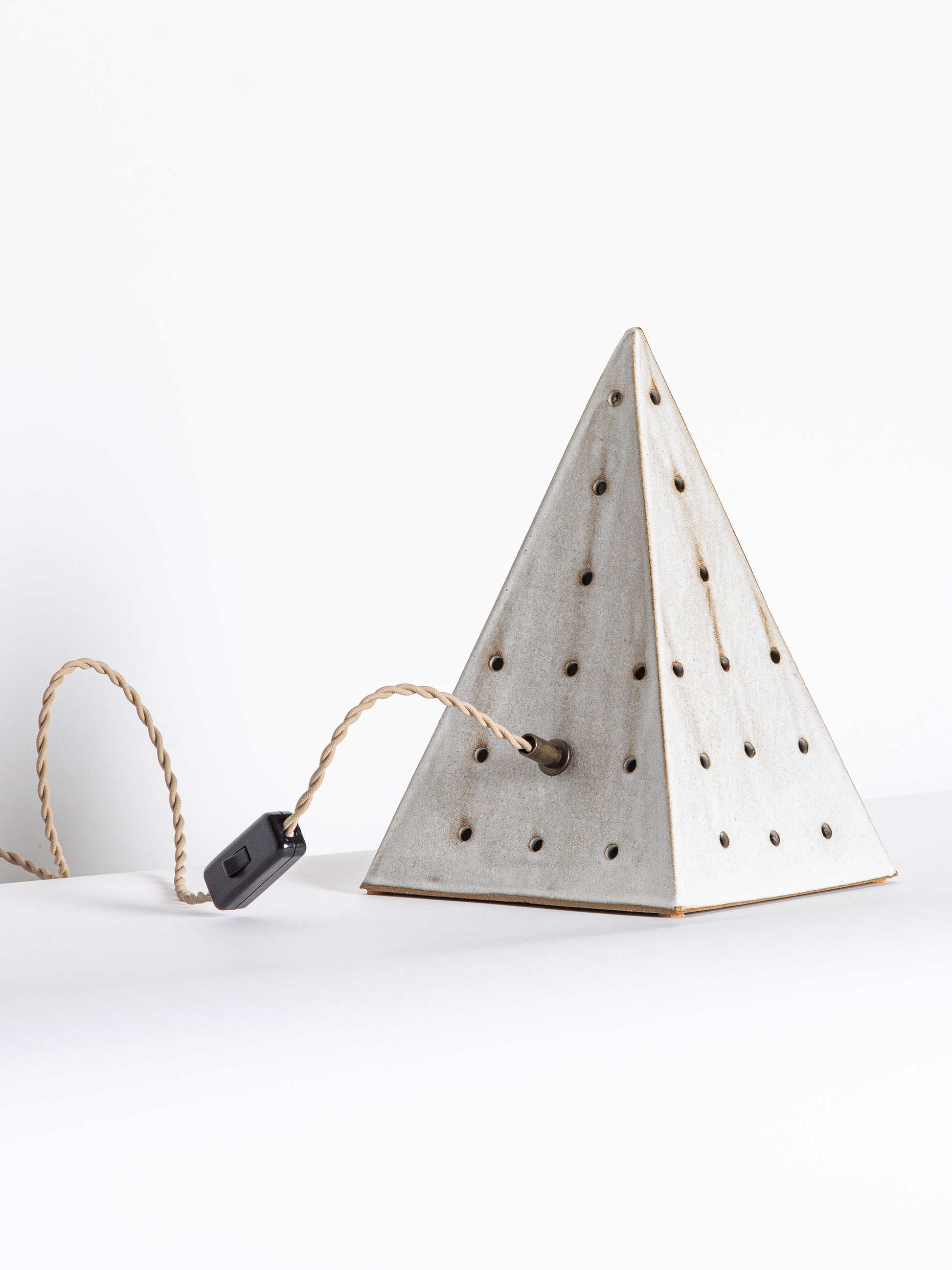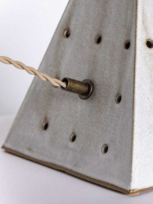 Our stoneware Hartnett Lamp is handcrafted using slab-construction techniques. The lamp’s pattern is created by cutting perforations by hand.