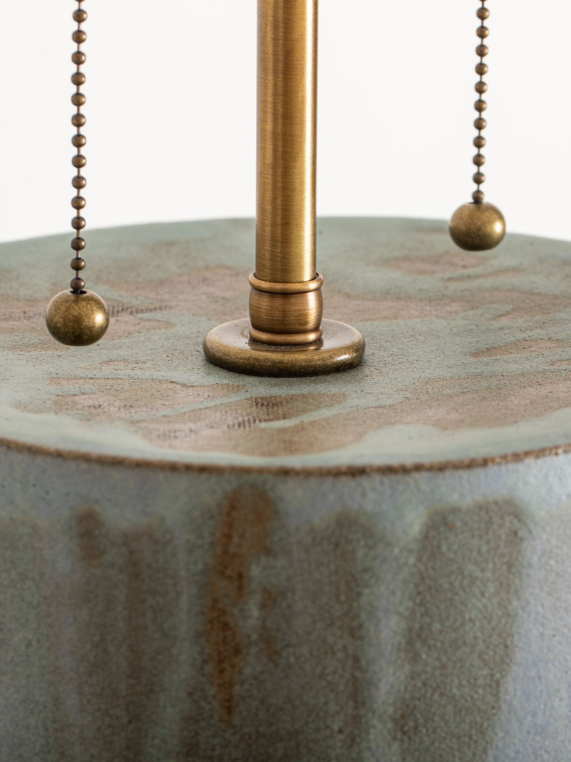 Pictured here in sea poured glaze, antique brass fittings, beige cloth cord, two-light cluster with pull-chain, and an off-white linen shade.
