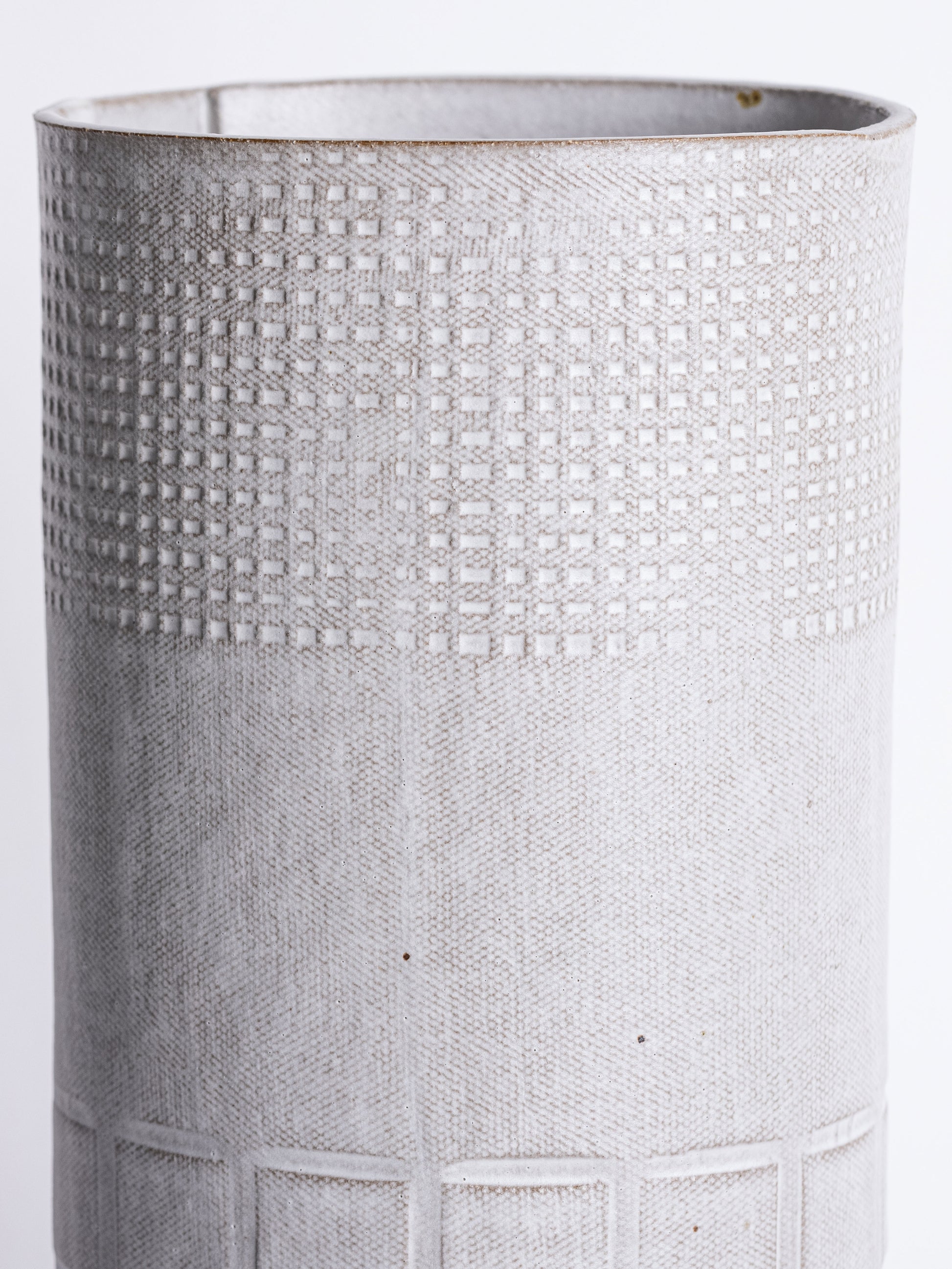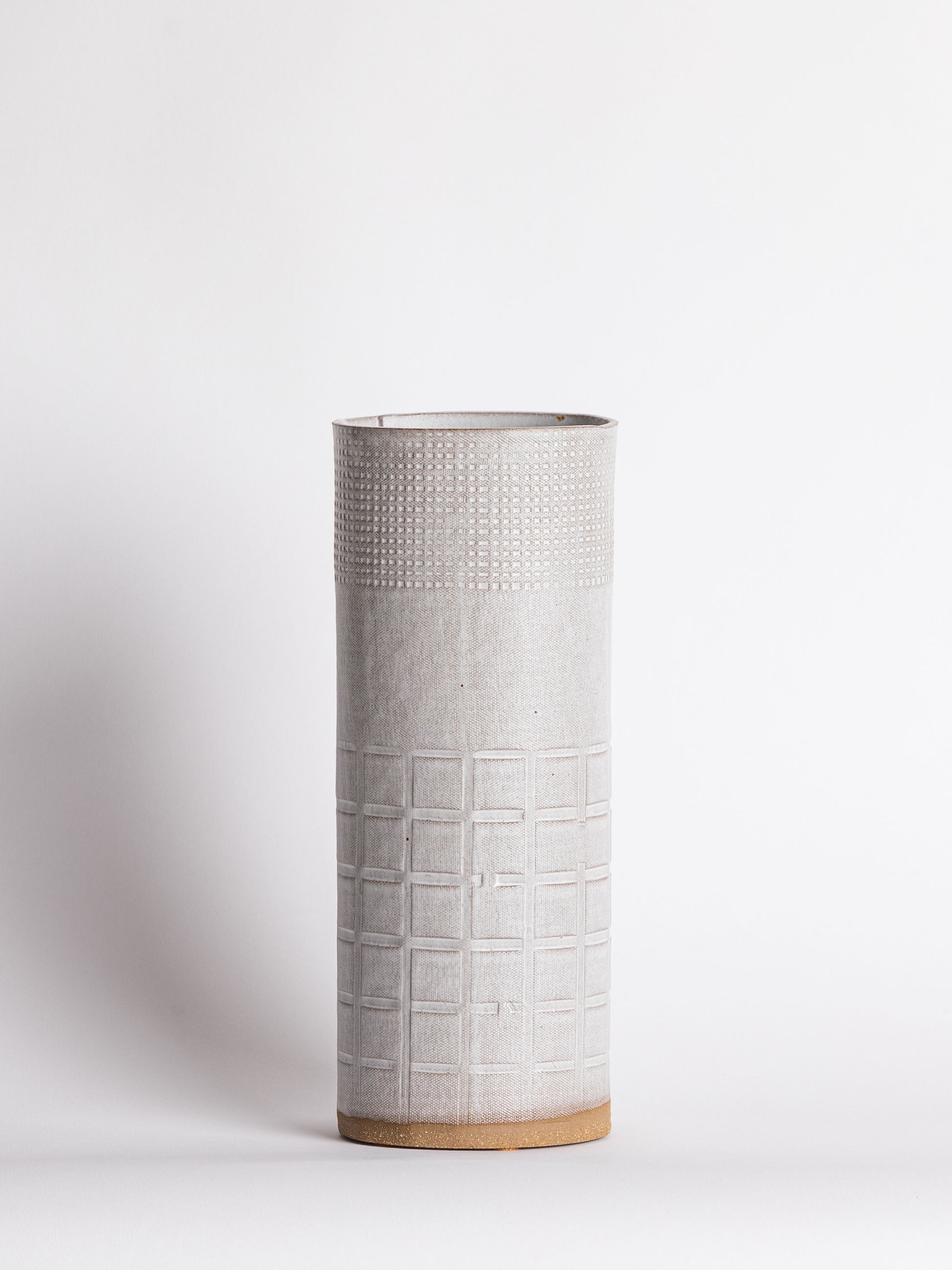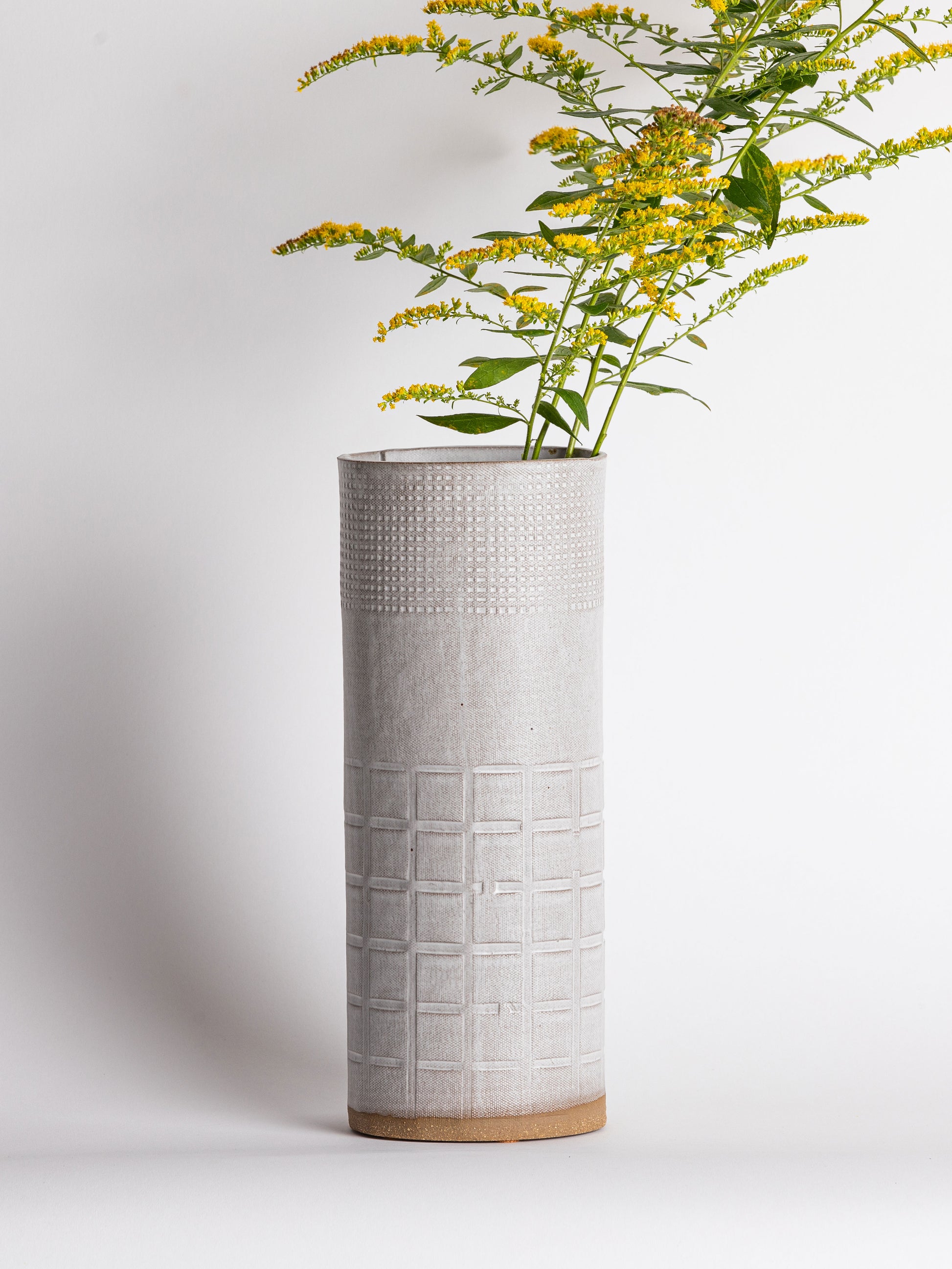 Our stoneware Owens Vase is handcrafted using slab-construction techniques. The vase's pattern is created by rolling the surface with textured rolling pins and rods.