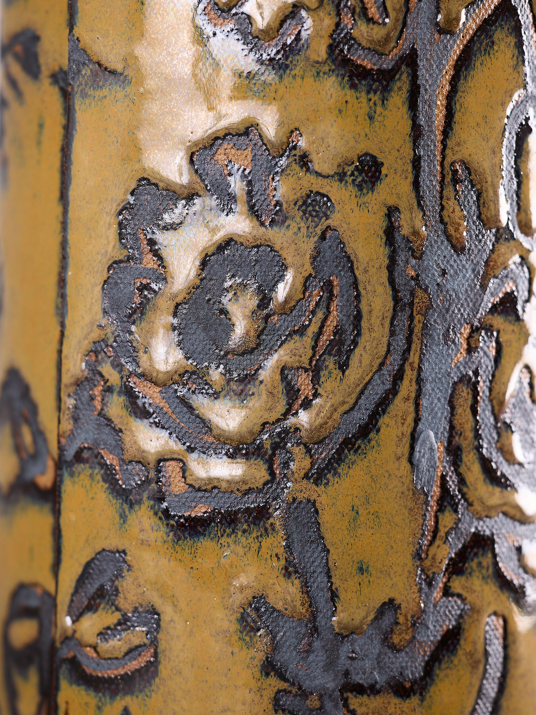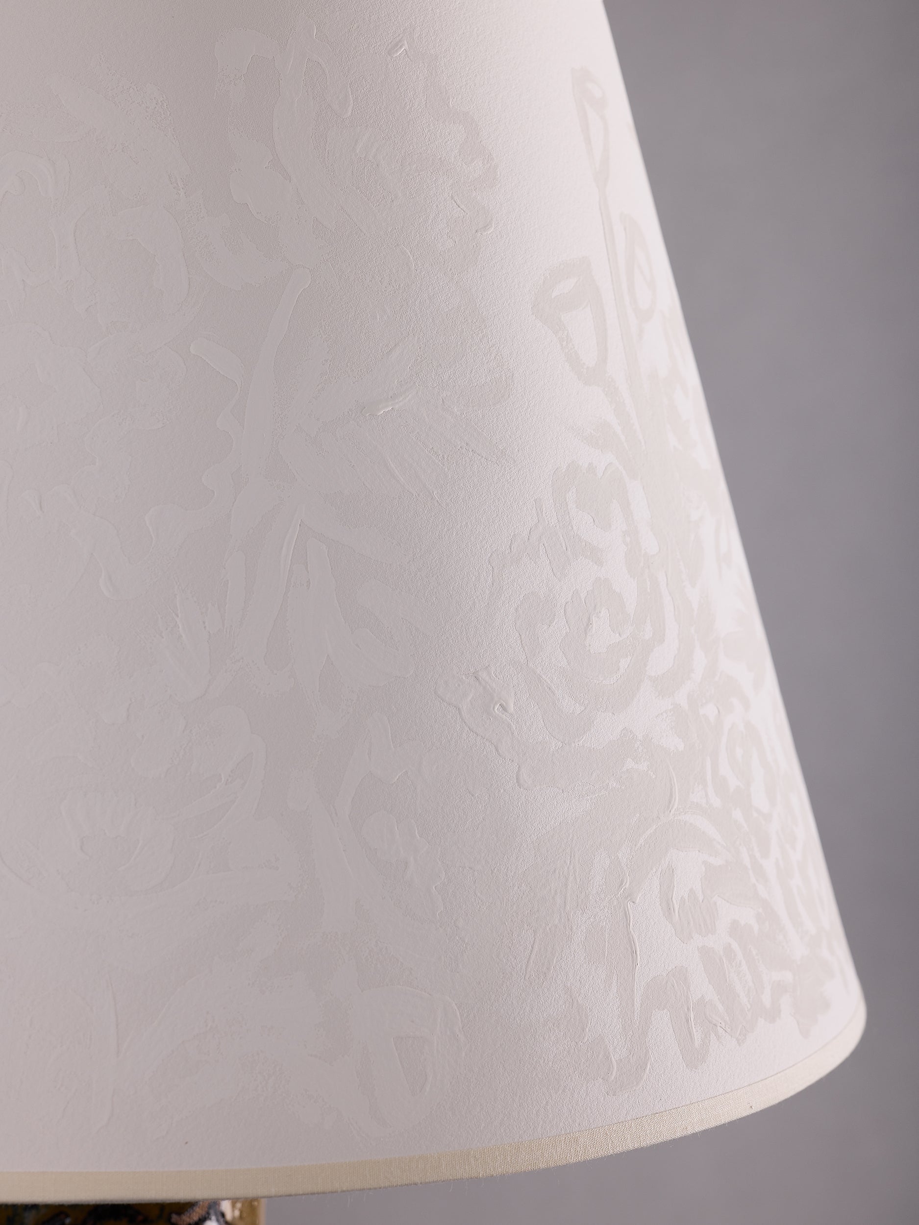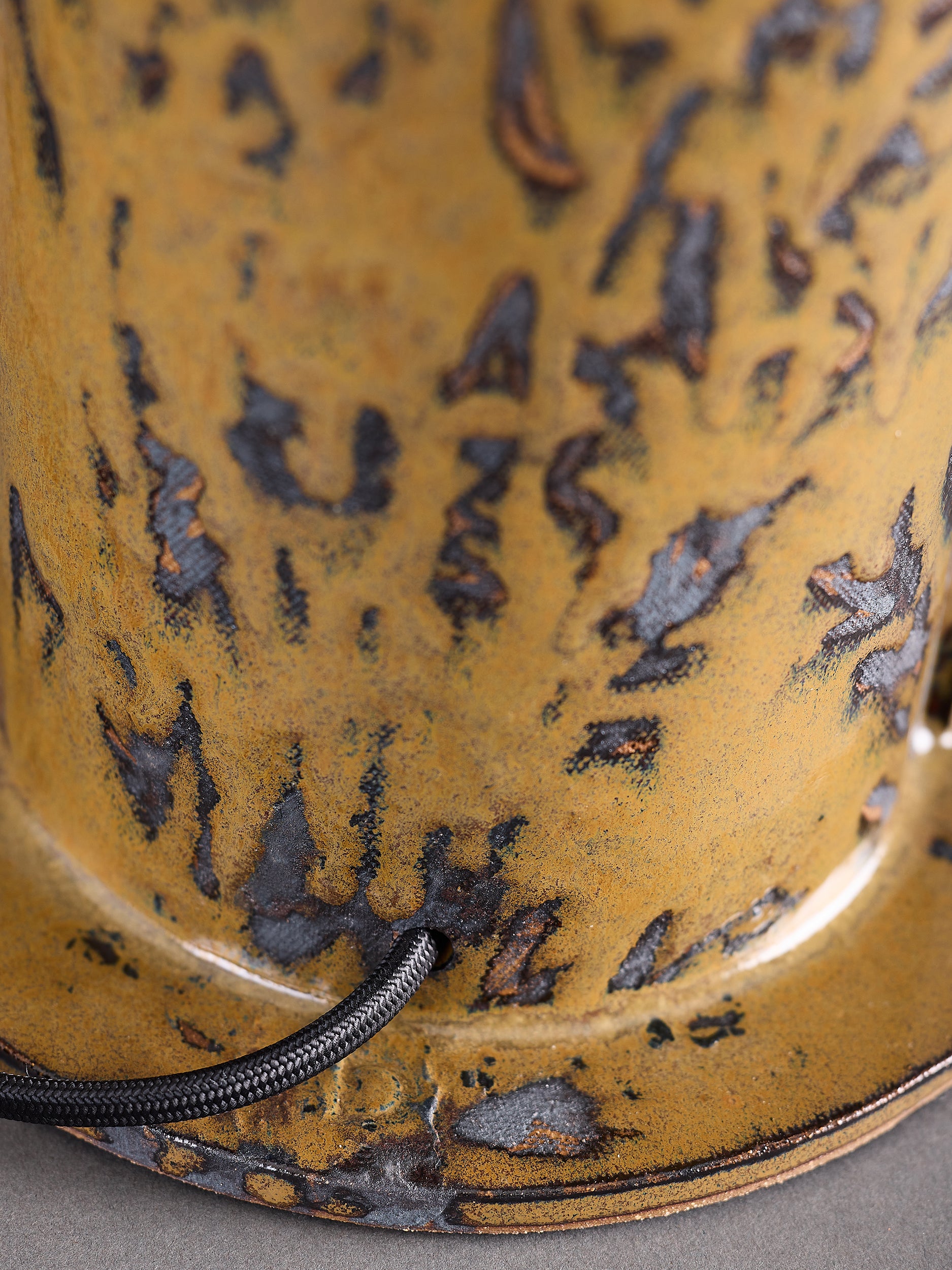 Pictured here in mushroom dipped glaze with black iron oxide underpainting, antique brass fittings, black cloth cord, full-range dimmer socket, and a hand painted archival watercolor paper shade in off-white.