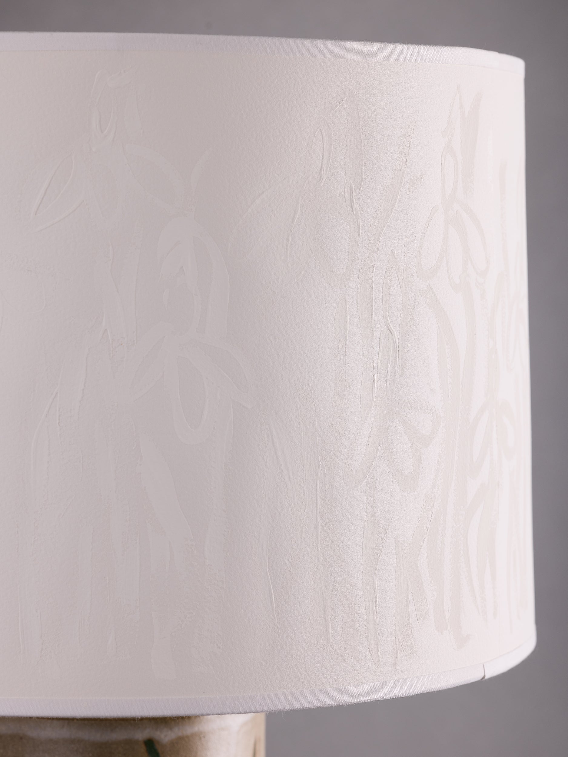 Pictured here in parchment dipped glaze with light green underpainting, antique brass fittings, beige cloth cord, full-range dimmer socket, and a hand painted archival watercolor paper shade in off-white.