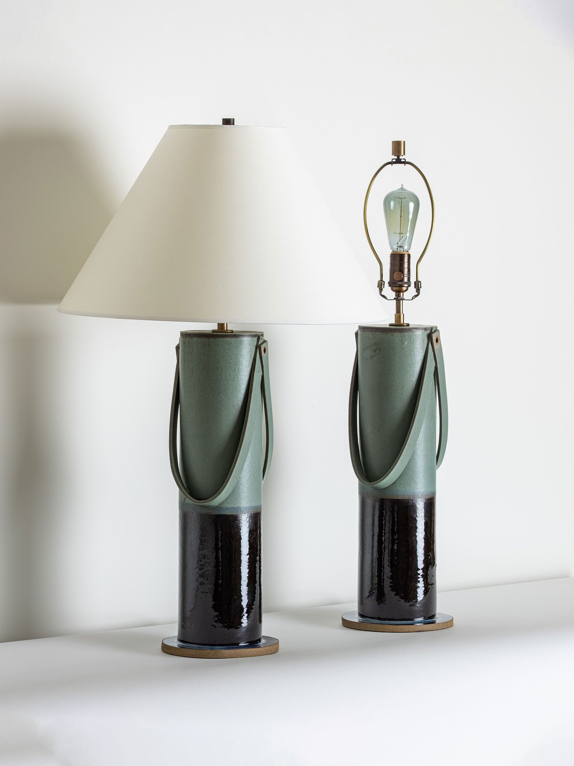 Pictured here in bottle-green and verdigris dipped glaze, antique brass fittings, black cloth cord, full-range dimmer socket, and an archival watercolor paper shade in off-white.