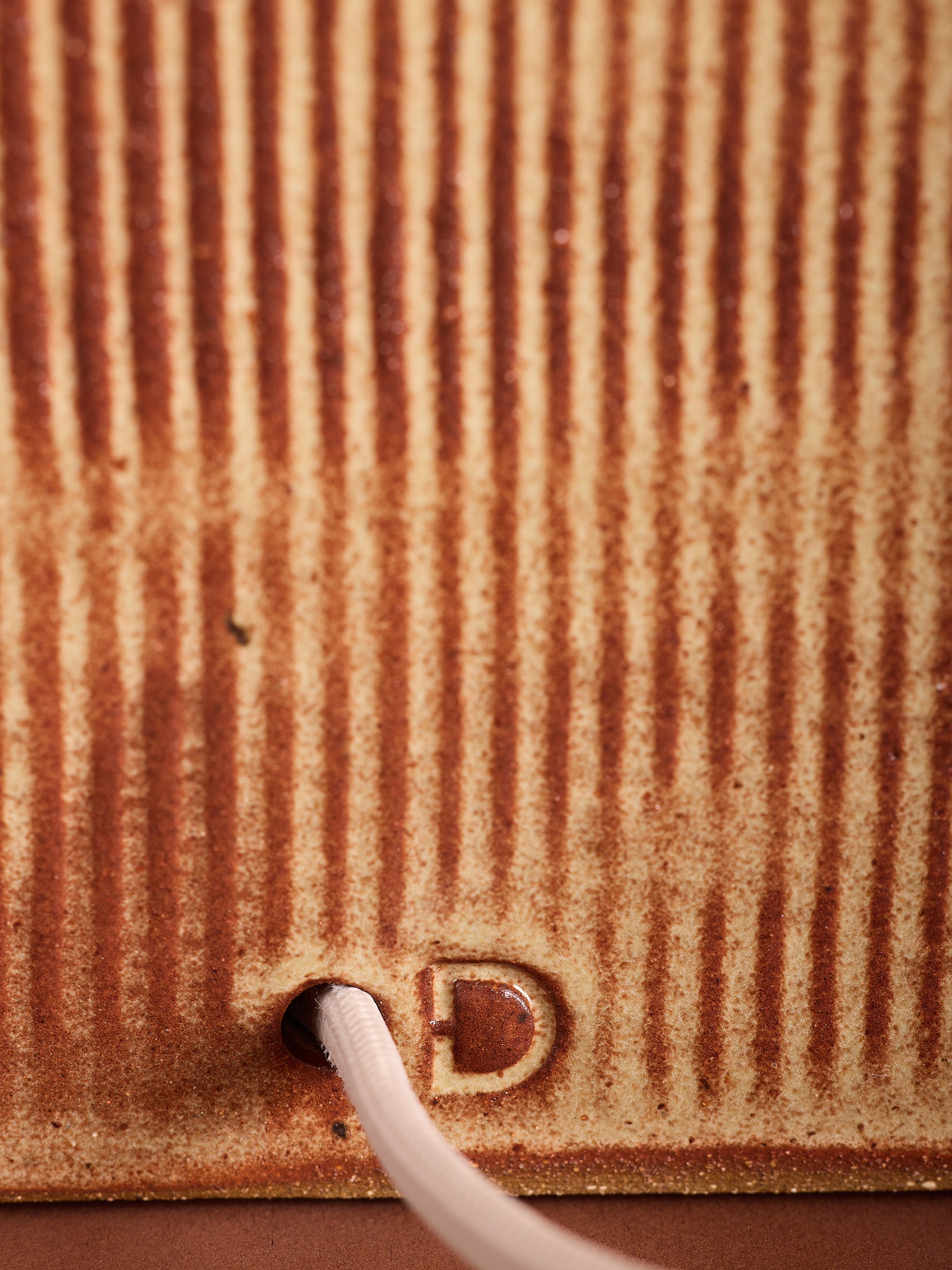 Our stoneware Caja Alta Table Lamp #2 is handcrafted using slab-construction techniques. The lamp’s pattern is created by rolling the surface with textured rolling pins and rods. The lamp’s sgraffiato pattern is created by scoring the surface with a wire-loop tool.