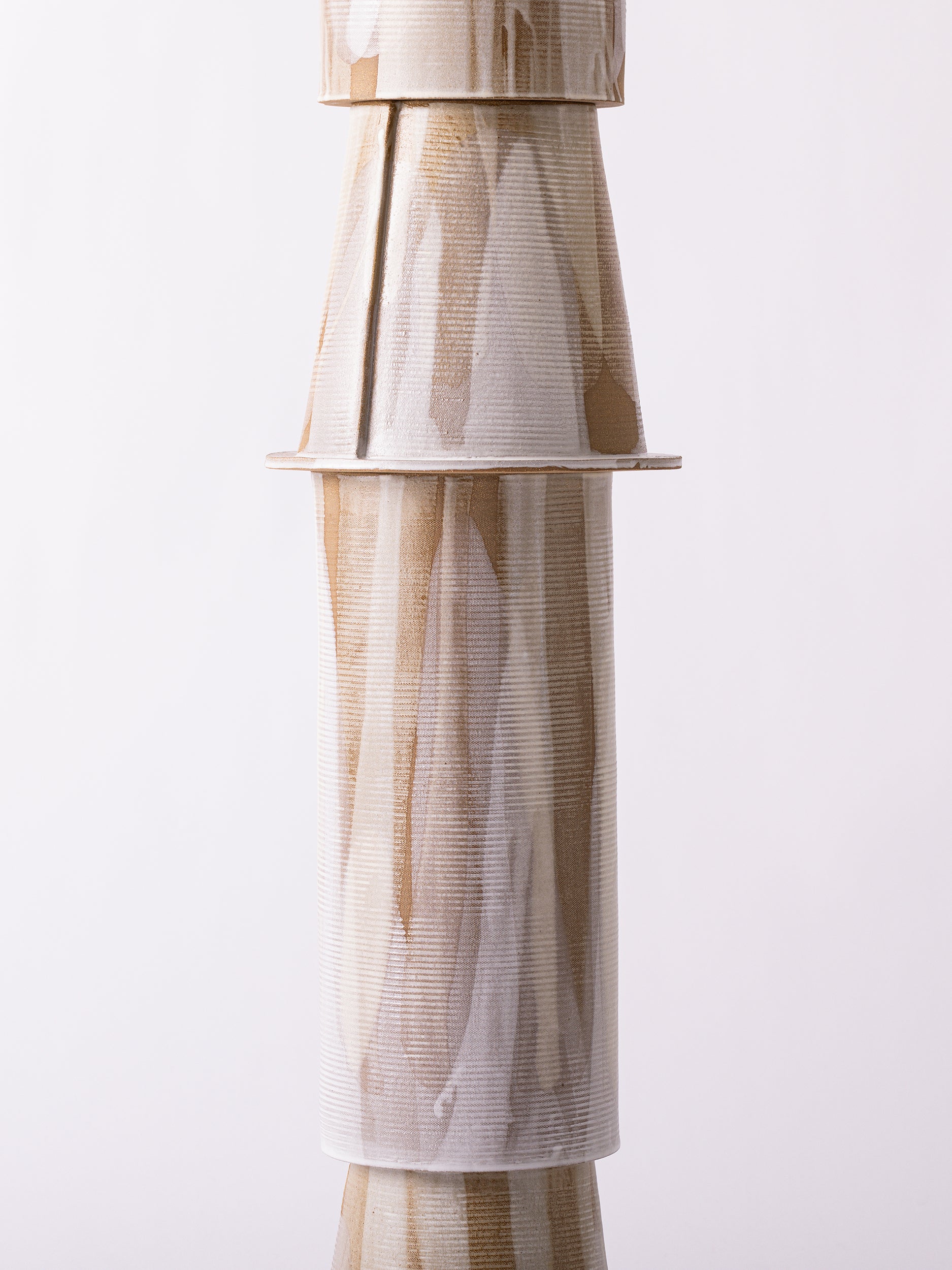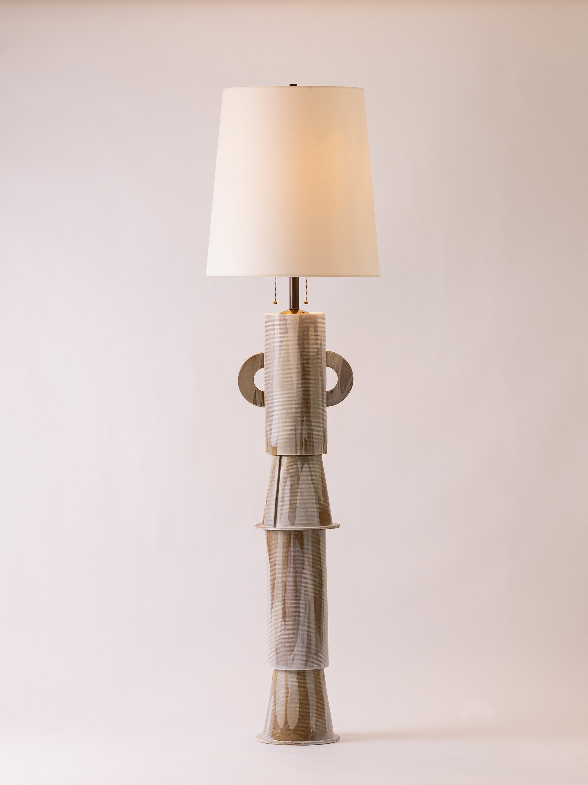Our stoneware Tetrad Floor Lamp is handcrafted using slab-construction techniques. The lamp’s pattern is created by rolling the surface with textured rolling pins and rods.