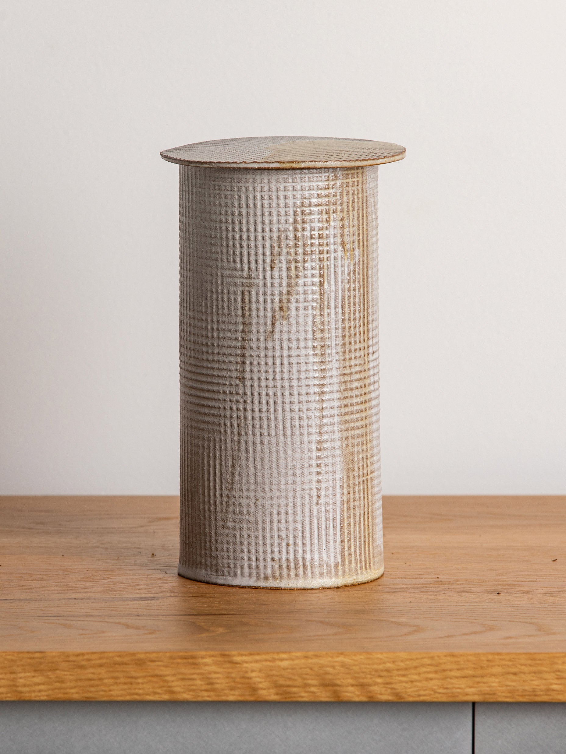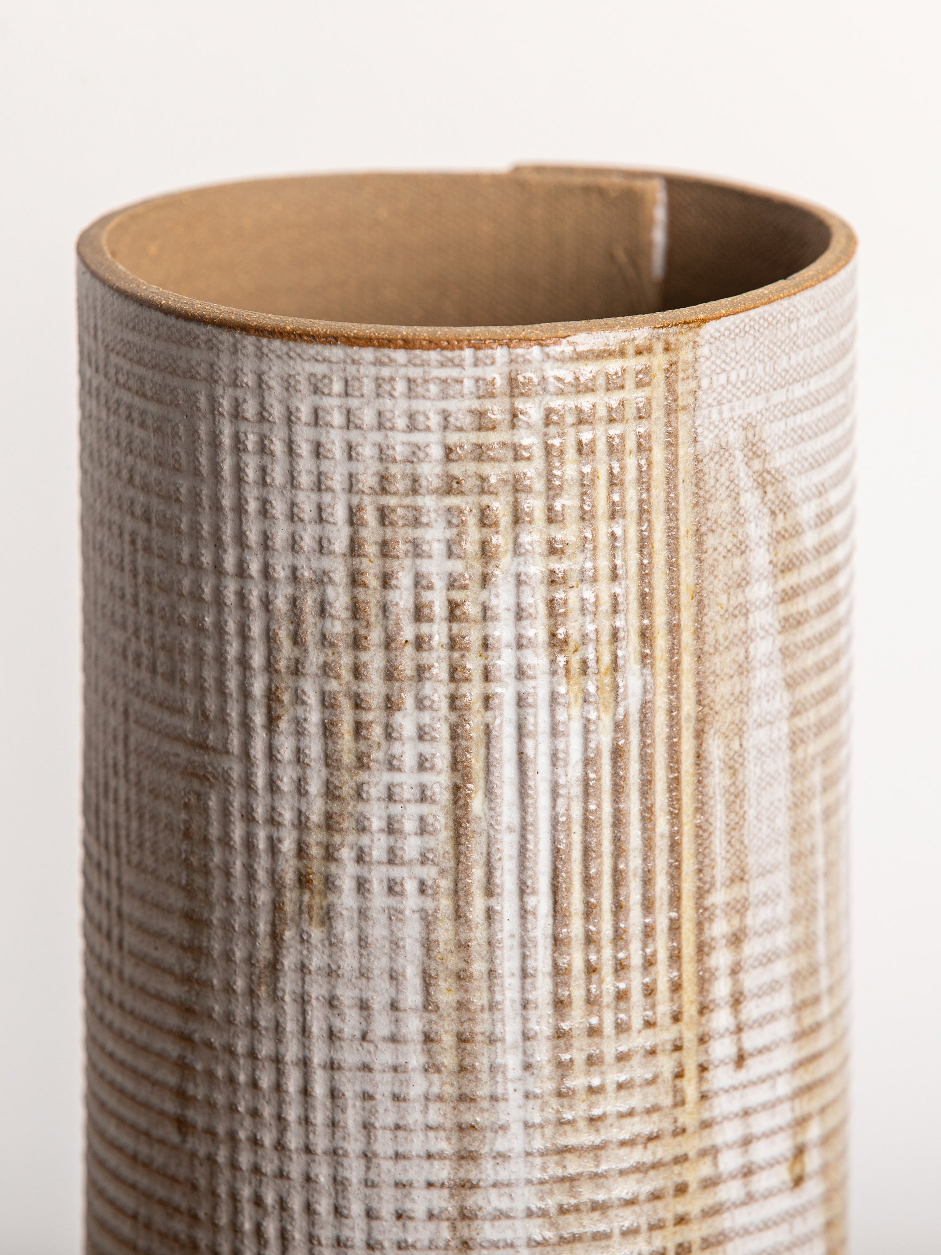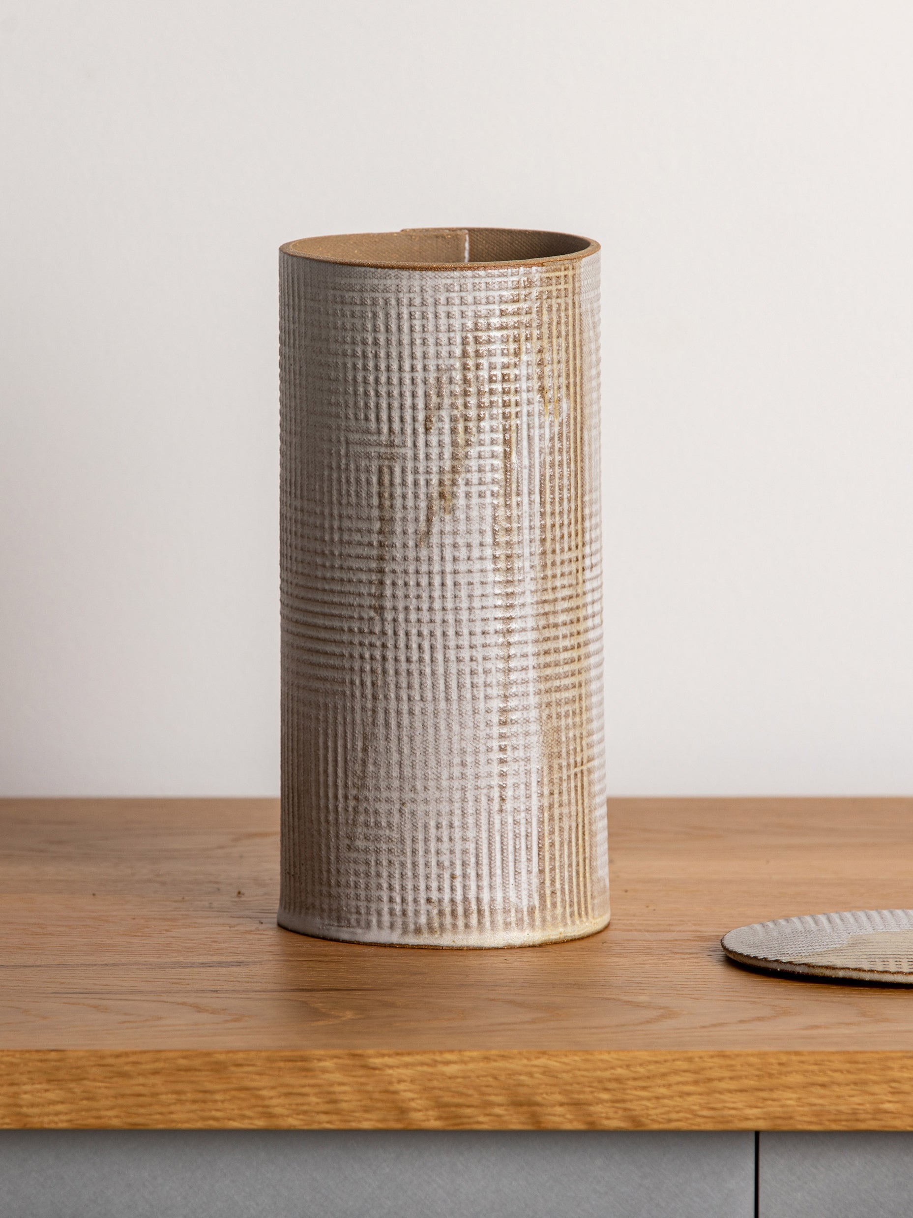 Our stoneware Thira Vase is handcrafted using slab-construction techniques. The vase's pattern is created by rolling the surface with textured rolling pins and rods.