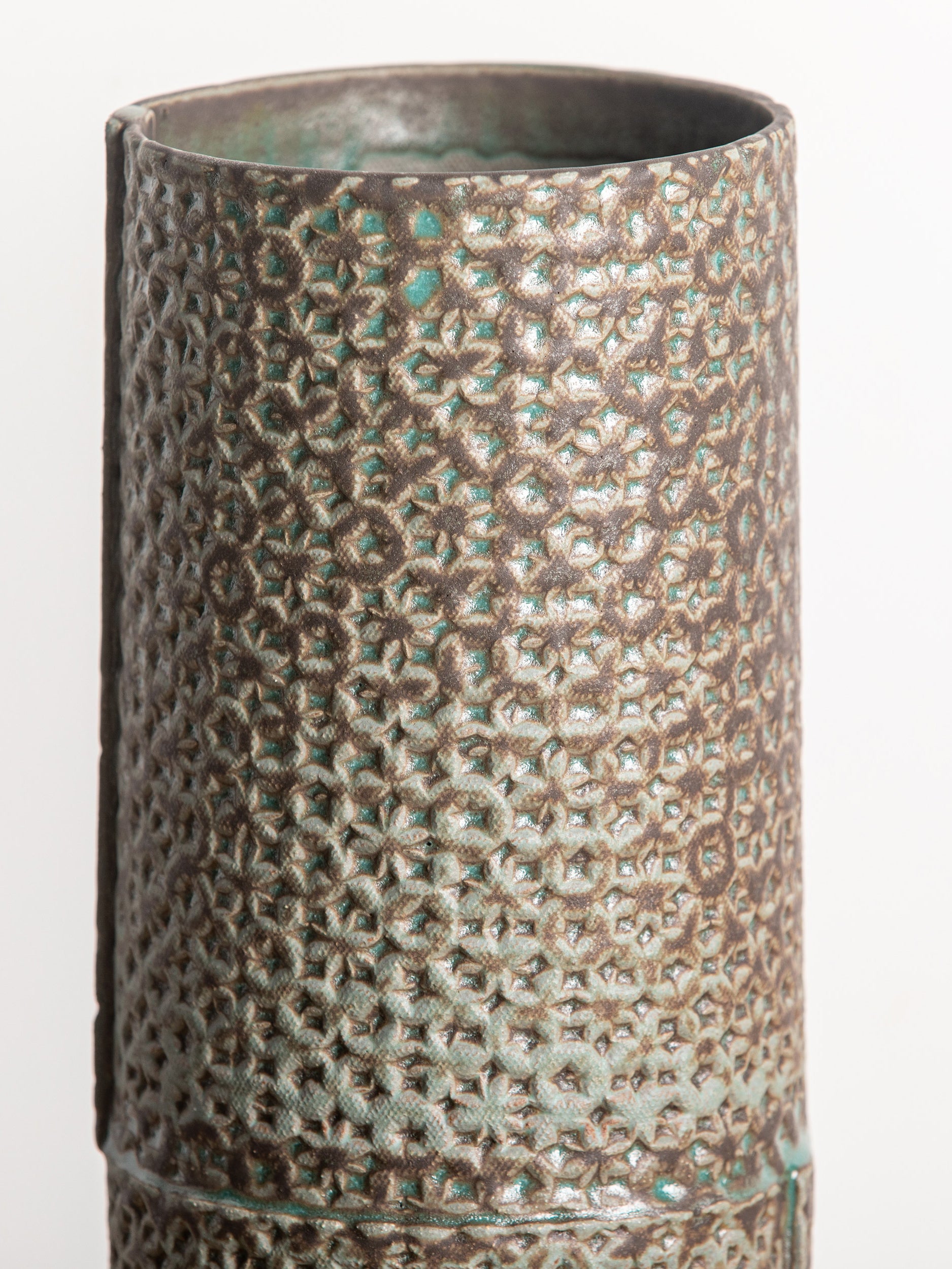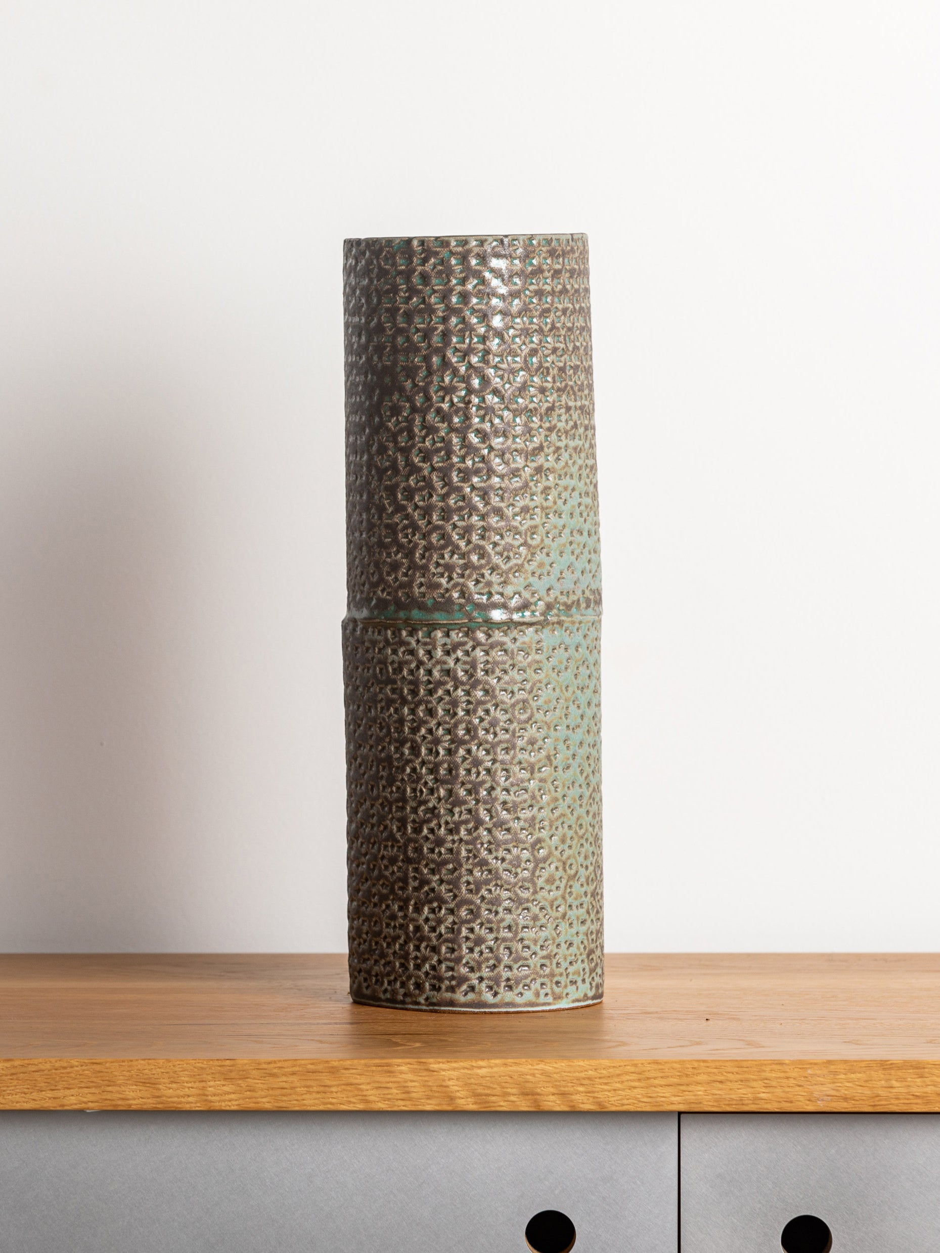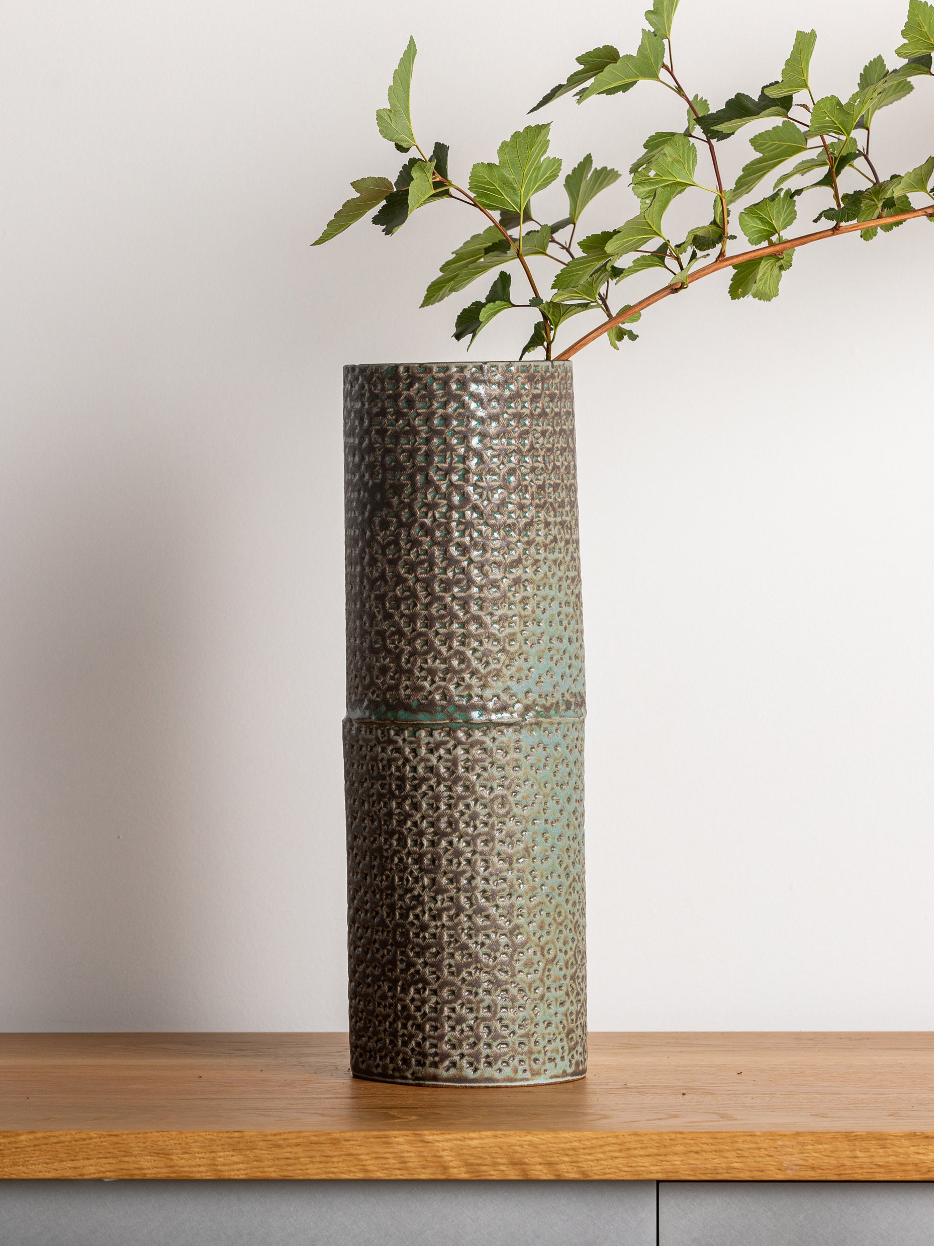 Our stoneware Tulliver Vase is handcrafted using slab-construction techniques. The vase's pattern is created by rolling the surface with textured rolling pins and rods.