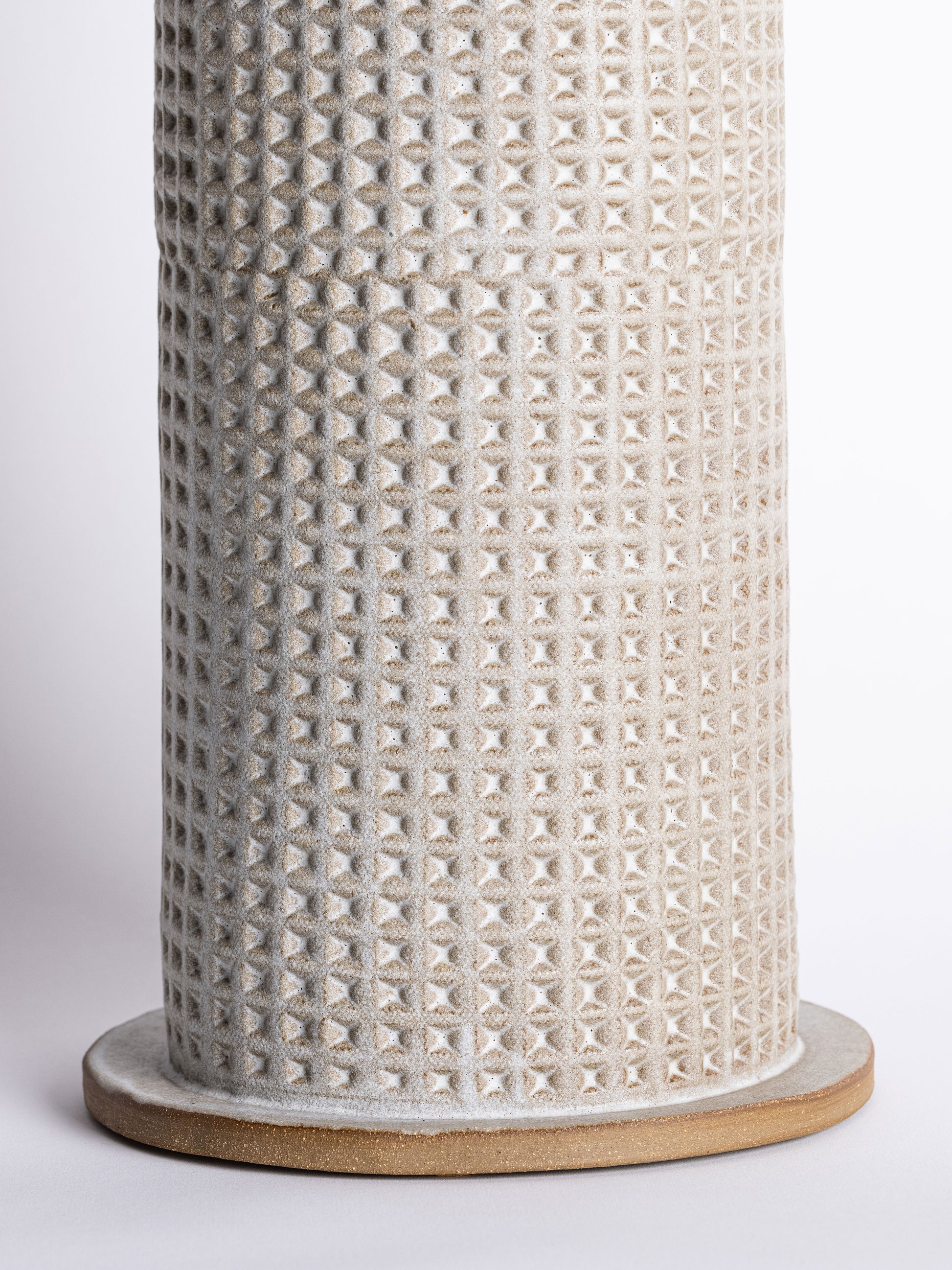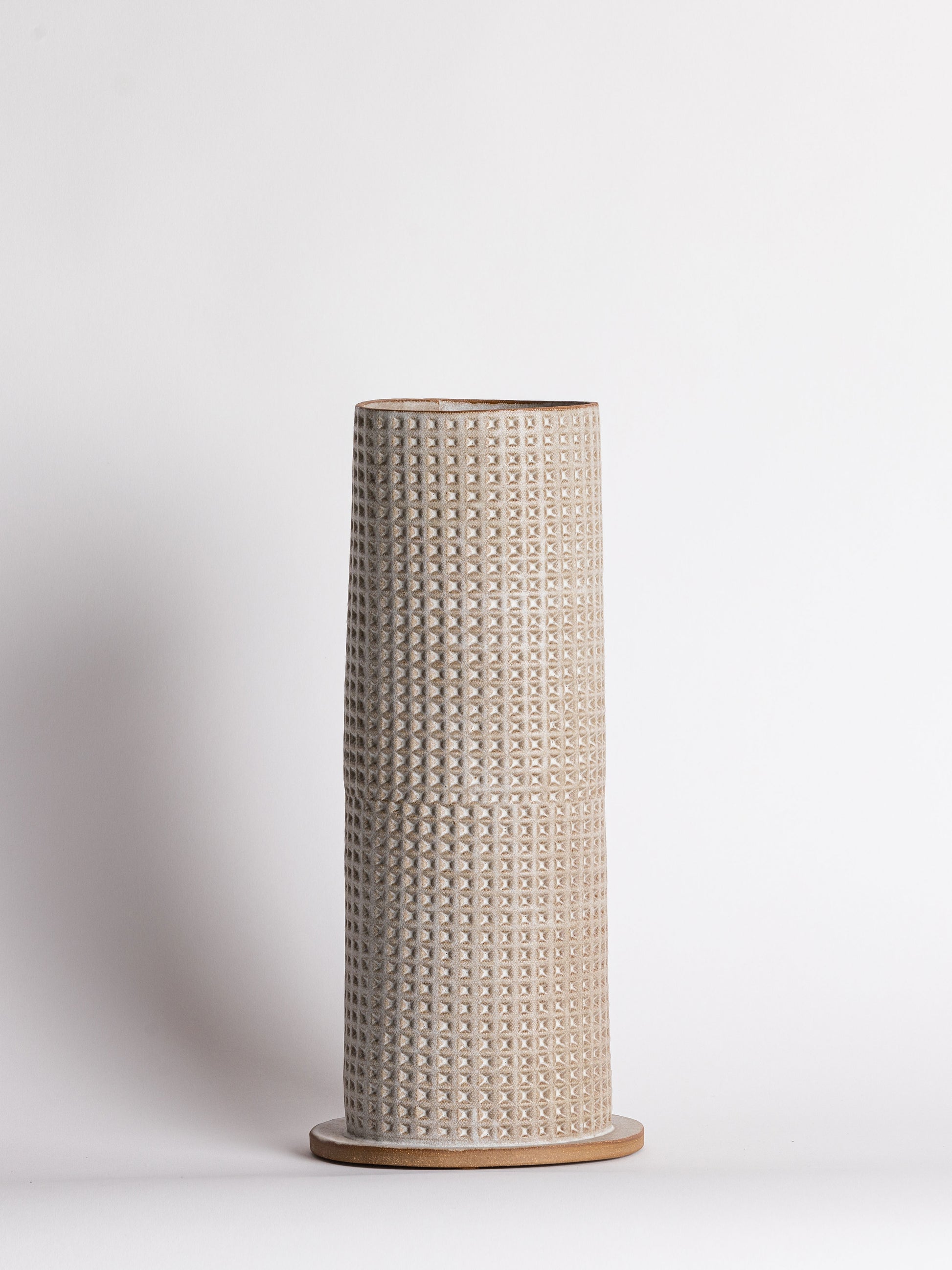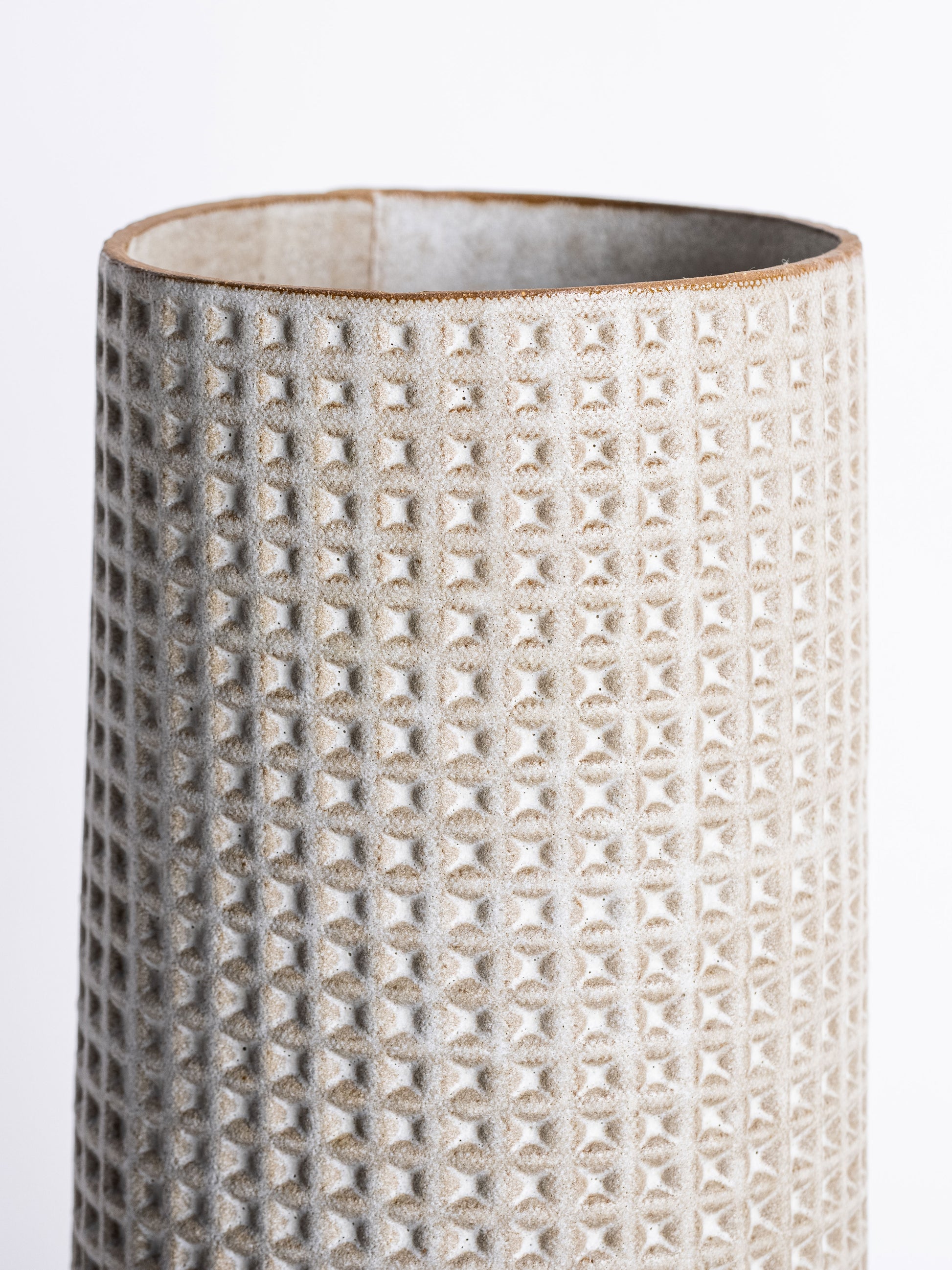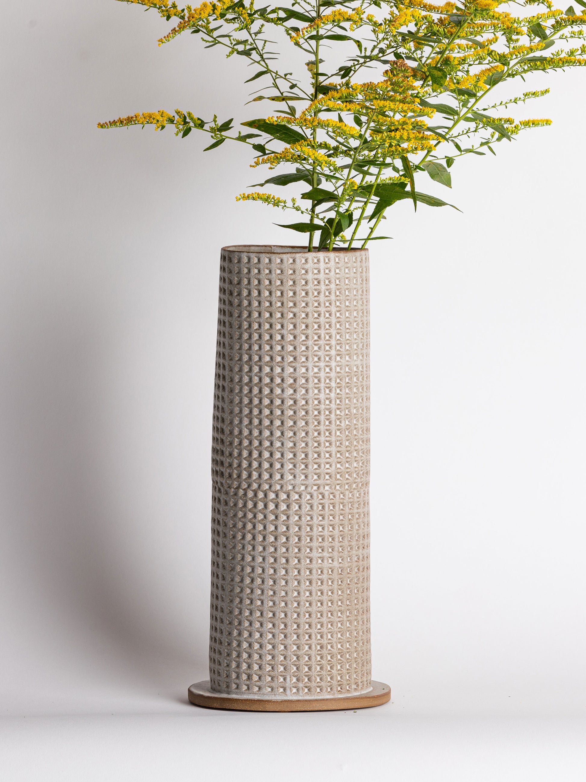 Our stoneware Walworth Vase is handcrafted using slab-construction techniques. The vase's pattern is created by rolling the surface with textured rolling pins and rods.